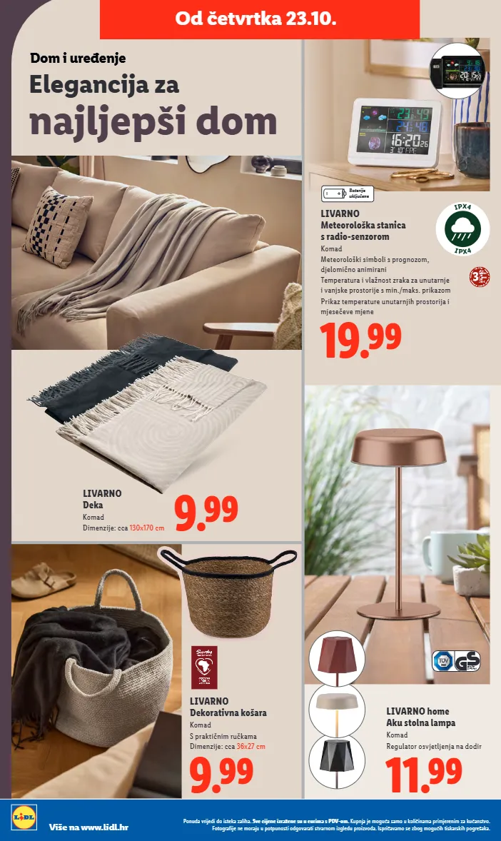 elegancija za najljepši dom dom i uređenje livarno meteorološka stanica s radio-senzorom komad meteorološki simboli s prognozom, djelomično animirani temperatura i vlažnost zraka za unutarnje i vanjske prostorije s min./maks. prikazom prikaz temperature unutarnjih prostorija i mjesečeve mjene 19.99 livarno dekorativna košara komad s praktičnim ručkama dimenzije: cca 36x27 cm 9.99 livarno home aku stolna lampa komad regulator osvjetljenja na dodir 11.99 od četvrtka 23.10. livarno deka komad dimenzije: cca 130x170 cm 9.99 baterije uključene i p x 4 i p x 4 ponuda vrijedi do isteka zaliha. sve cijene izražene su u eurima s pdv-om. kupnja je moguća samo u količinama primjerenim za kućanstvo. fotografije ne moraju u potpunosti odgovarati stvarnom izgledu proizvoda. ispričavamo se zbog mogućih tiskarskih pogrešaka. više na www.lidl.hr