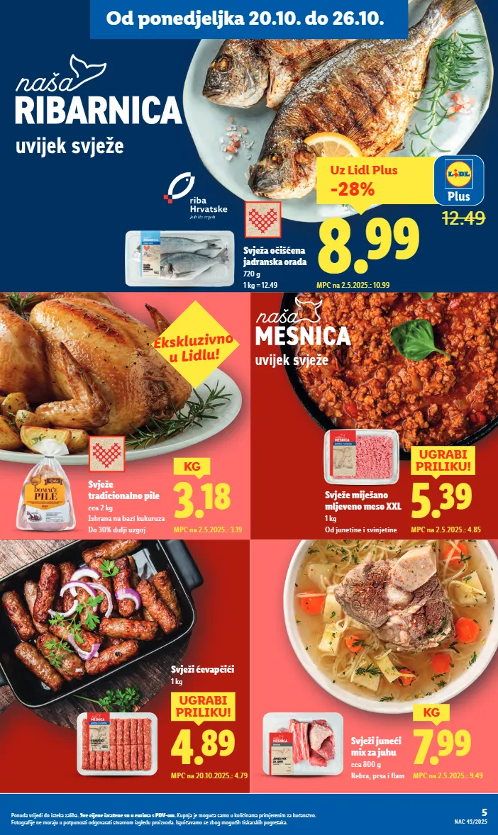 3.18 kg mpc na 2.5.2025.: 3.19 svježe tradicionalno pile cca 2 kg ishrana na bazi kukuruza do 30% dulji uzgoj ekskluzivno u lidlu! 5.39 ugrabi priliku! mpc na 2.5.2025.: 4.85 svježe miješano mljeveno meso xxl 1 kg od junetine i svinjetine 4.89 ugrabi priliku! mpc na 20.10.2025.: 4.79 svježi ćevapčići 1 kg svježa očišćena jadranska orada 720 g 1 kg = 12.49 svježi juneći mix za juhu cca 800 g rebra, prsa i flam 7.99 kg mpc na 2.5.2025.: 9.49 uz lidl plus -28% 8.99 12.49 mpc na 2.5.2025.: 10.99 5 nac 43/2025 ponuda vrijedi do isteka zaliha. sve cijene izražene su u eurima s pdv-om. kupnja je moguća samo u količinama primjerenim za kućanstvo. fotografije ne moraju u potpunosti odgovarati stvarnom izgledu proizvoda. ispričavamo se zbog mogućih tiskarskih pogrešaka. od ponedjeljka 20.10. do 26.10.
