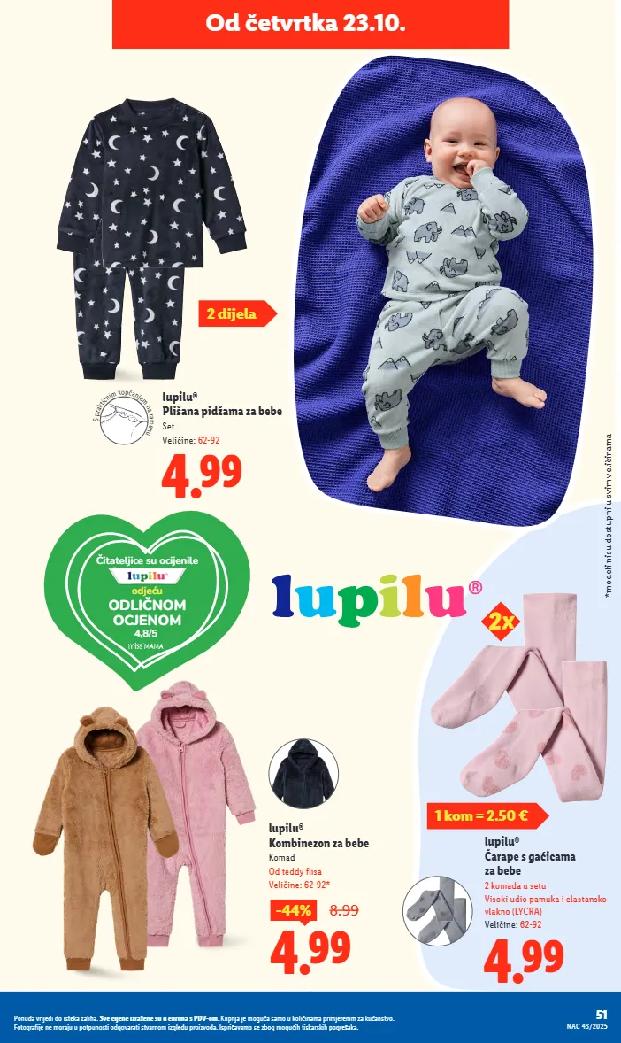 od četvrtka 23.10. lupilu® čarape s gaćicama za bebe 2 komada u setu visoki udio pamuka i elastansko vlakno (lycra) veličine: 62-92 4.99 lupilu® plišana pidžama za bebe set veličine: 62-92 4.99 2 dijela čitateljice su ocijenile odličnom ocjenom 4,8/5 odjeću 1 kom = 2.50 € s p r a k t i č n i m k o p č a n j e m n a r a m e n u 2x lupilu® kombinezon za bebe komad od teddy flisa veličine: 62-92* 4.99 -44% 8.99 *modeli nisu dostupni u svim veličinama 51 nac 43/2025 ponuda vrijedi do isteka zaliha. sve cijene izražene su u eurima s pdv-om. kupnja je moguća samo u količinama primjerenim za kućanstvo. fotografije ne moraju u potpunosti odgovarati stvarnom izgledu proizvoda. ispričavamo se zbog mogućih tiskarskih pogrešaka.