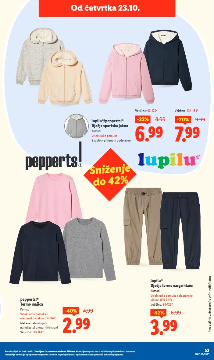 od četvrtka 23.10. lupilu®/pepperts!® dječja sportska jakna komad visoki udio pamuka s toplom plišanom podstavom 6.99 -22% 8.99 pepperts!® termo majica komad visoki udio pamuka i elastansko vlakno (lycra®) mekana zahvaljujući pahuljastoj unutarnjoj strani veličine: 134-164* 2.99 -40% 4.99 lupilu® dječje termo cargo hlače komad visoki udio pamuka i elastansko vlakno (lycra®) veličine: 98-128* 3.99 -42% 6.99 7.99 -20% 9.99 veličine: 134-164* veličine: 98-128* *modeli nisu dostupni u svim veličinama sniženje do 42% 53 nac 43/2025 ponuda vrijedi do isteka zaliha. sve cijene izražene su u eurima s pdv-om. kupnja je moguća samo u količinama primjerenim za kućanstvo. fotografije ne moraju u potpunosti odgovarati stvarnom izgledu proizvoda. ispričavamo se zbog mogućih tiskarskih pogrešaka.