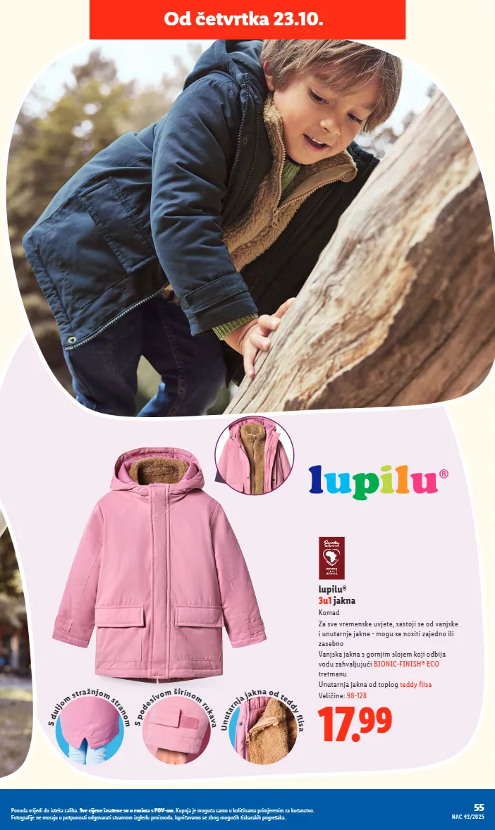lupilu® 3u1 jakna komad za sve vremenske uvjete, sastoji se od vanjske i unutarnje jakne - mogu se nositi zajedno ili zasebno vanjska jakna s gornjim slojem koji odbija vodu zahvaljujući bionic-finish® eco tretmanu unutarnja jakna od toplog teddy flisa veličine: 98-128 17.99 od četvrtka 23.10. s d u l j o m s t r a ž n j o m s t r a n o m s p o d e s i v o m š i r i n o m r u k a v a u n u t a r n j a j a k n a o d t e d d y f i s a 55 nac 43/2025 ponuda vrijedi do isteka zaliha. sve cijene izražene su u eurima s pdv-om. kupnja je moguća samo u količinama primjerenim za kućanstvo. fotografije ne moraju u potpunosti odgovarati stvarnom izgledu proizvoda. ispričavamo se zbog mogućih tiskarskih pogrešaka.