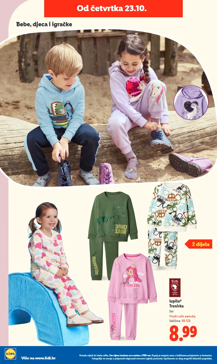 lupilu® trenirka set visoki udio pamuka veličine: 98-128 8.99 bebe, djeca i igračke od četvrtka 23.10. 2 dijela ponuda vrijedi do isteka zaliha. sve cijene izražene su u eurima s pdv-om. kupnja je moguća samo u količinama primjerenim za kućanstvo. fotografije ne moraju u potpunosti odgovarati stvarnom izgledu proizvoda. ispričavamo se zbog mogućih tiskarskih pogrešaka. više na www.lidl.hr