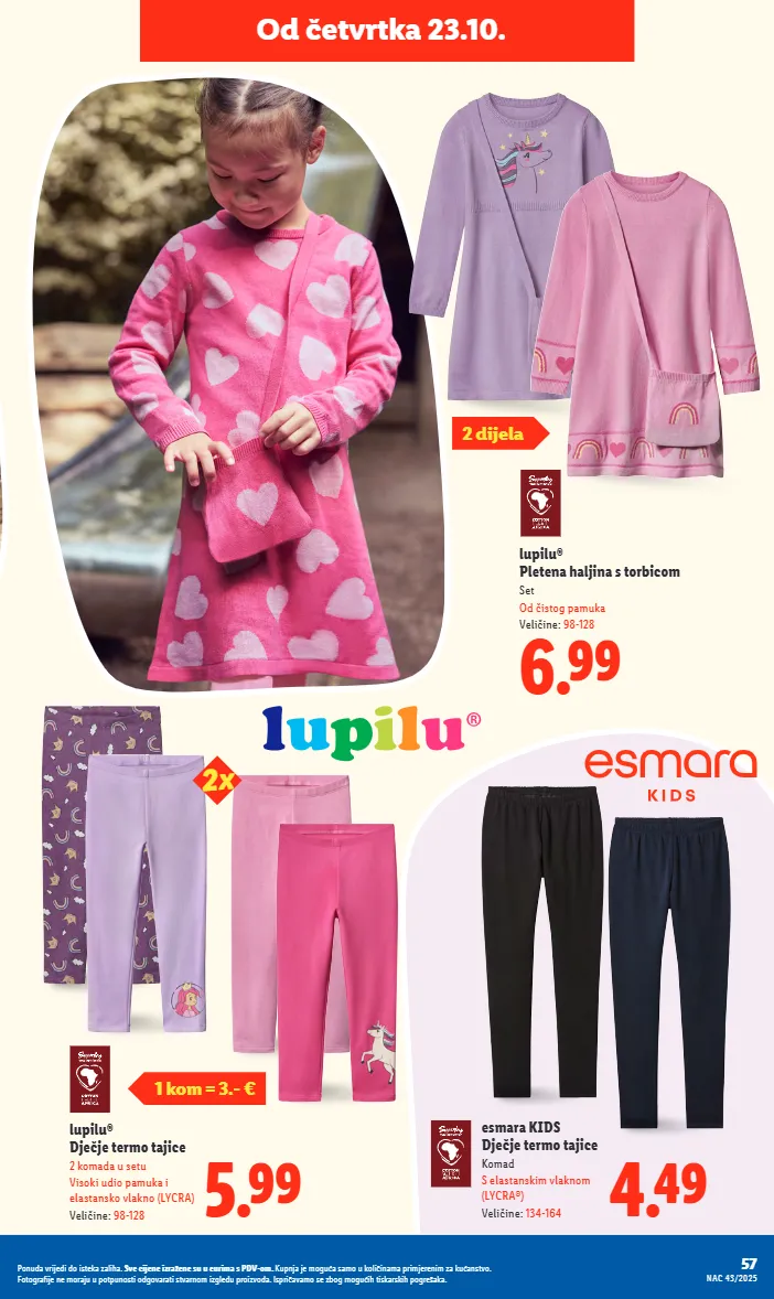 lupilu® dječje termo tajice 2 komada u setu visoki udio pamuka i elastansko vlakno (lycra) veličine: 98-128 5.99 1 kom = 3.- € esmara kids dječje termo tajice komad s elastanskim vlaknom (lycra®) veličine: 134-164 4.49 od četvrtka 23.10. lupilu® pletena haljina s torbicom set od čistog pamuka veličine: 98-128 6.99 2x 2 dijela 57 nac 43/2025 ponuda vrijedi do isteka zaliha. sve cijene izražene su u eurima s pdv-om. kupnja je moguća samo u količinama primjerenim za kućanstvo. fotografije ne moraju u potpunosti odgovarati stvarnom izgledu proizvoda. ispričavamo se zbog mogućih tiskarskih pogrešaka.