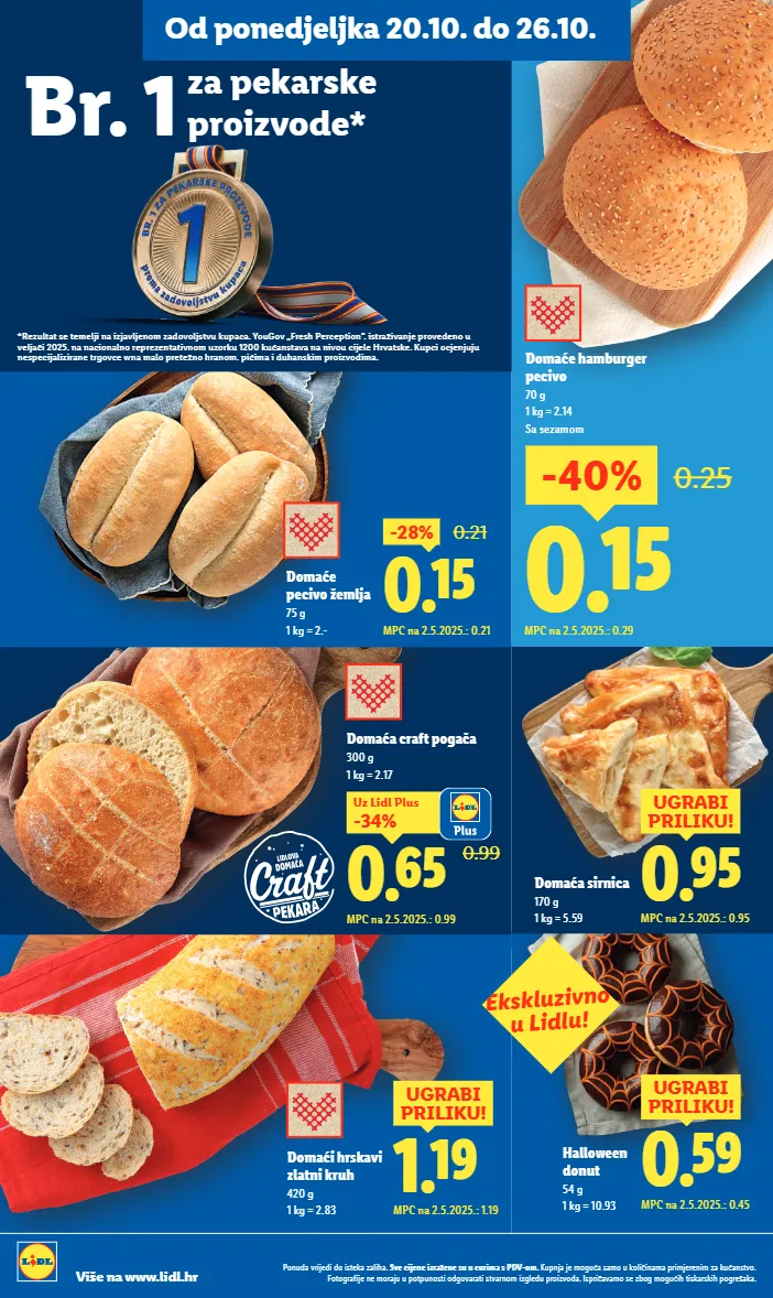 0.99 0.65 -34% uz lidl plus mpc na 2.5.2025.: 0.99 domaća craft pogača 300 g 1 kg = 2.17 *rezultat se temelji na izjavljenom zadovoljstvu kupaca. yougov „fresh perception”. istraživanje provedeno u veljači 2025. na nacionalno reprezentativnom uzorku 1200 kućanstava na nivou cijele hrvatske. kupci ocjenjuju nespecijalizirane trgovce wna malo pretežno hranom. pićima i duhanskim proizvodima. 0.59 ugrabi priliku! mpc na 2.5.2025.: 0.45 halloween donut 54 g 1 kg = 10.93 0.95 ugrabi priliku! mpc na 2.5.2025.: 0.95 domaća sirnica 170 g 1 kg = 5.59 1.19 ugrabi priliku! mpc na 2.5.2025.: 1.19 domaći hrskavi zlatni kruh 420 g 1 kg = 2.83 0.15 -28% 0.21 mpc na 2.5.2025.: 0.21 domaće pecivo žemlja 75 g 1 kg = 2.- domaće hamburger pecivo 70 g 1 kg = 2.14 sa sezamom br. 1 za pekarske proizvode* 0.15 0.25 mpc na 2.5.2025.: 0.29 -40% ekskluzivno u lidlu! ponuda vrijedi do isteka zaliha. sve cijene izražene su u eurima s pdv-om. kupnja je moguća samo u količinama primjerenim za kućanstvo. fotografije ne moraju u potpunosti odgovarati stvarnom izgledu proizvoda. ispričavamo se zbog mogućih tiskarskih pogrešaka. više na www.lidl.hr od ponedjeljka 20.10. do 26.10.