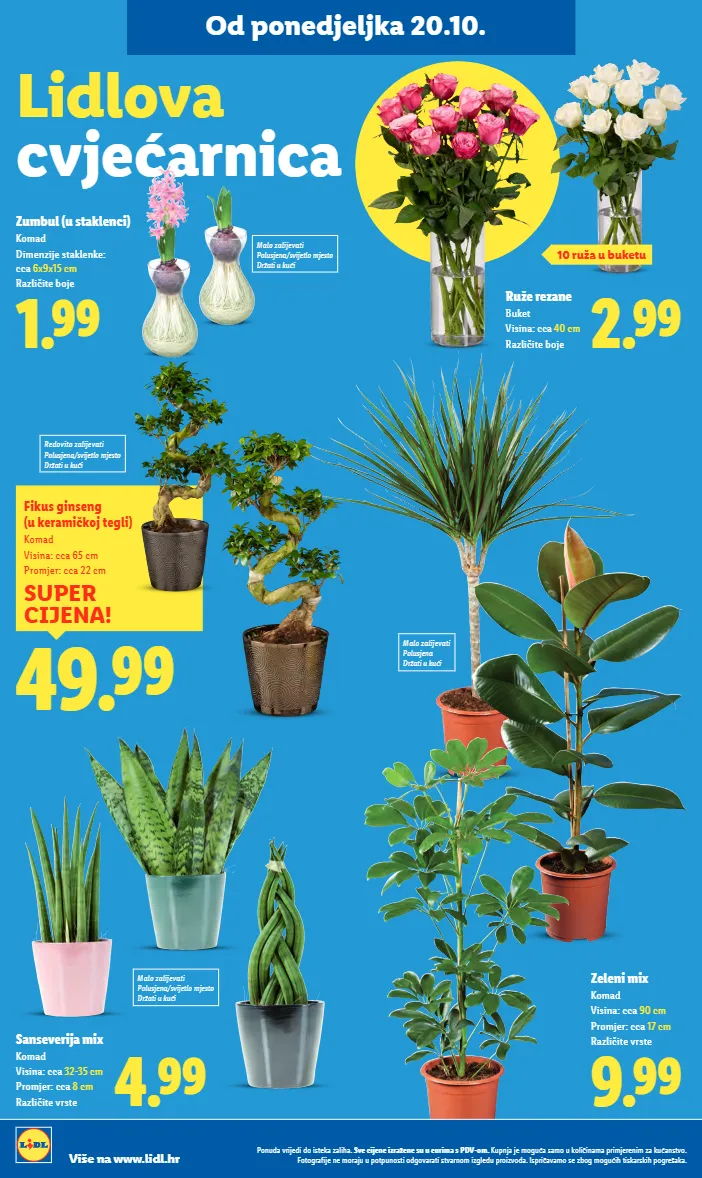 2.99 Ruže rezane Buket Visina: cca 40 cm Različite boje Od ponedjeljka 20.10. 10 ruža u buketu 1.99 Zumbul (u staklenci) Komad Dimenzije staklenke: cca 6x9x15 cm Različite boje 4.99 Sanseverija mix Komad Visina: cca 32-35 cm Promjer: cca 8 cm Različite vrste Malo zalijevati Polusjena/svijetlo mjesto Držati u kući Malo zalijevati Polusjena Držati u kući Redovito zalijevati Polusjena/svijetlo mjesto Držati u kući Lidlova cvjećarnica Ponuda vrijedi do isteka zaliha. Sve cijene izražene su u eurima s PDV-om. Kupnja je moguća samo u količinama primjerenim za kućanstvo. Fotografije ne moraju u potpunosti odgovarati stvarnom izgledu proizvoda. Ispričavamo se zbog mogućih tiskarskih pogrešaka. Više na www.lidl.hr 9.99 Zeleni mix Komad Visina: cca 90 cm Promjer: cca 17 cm Različite vrste 49.99 SUPER CIJENA! Fikus ginseng (u keramičkoj tegli) Komad Visina: cca 65 cm Promjer: cca 22 cm Malo zalijevati Polusjena/svijetlo mjesto Držati u kući