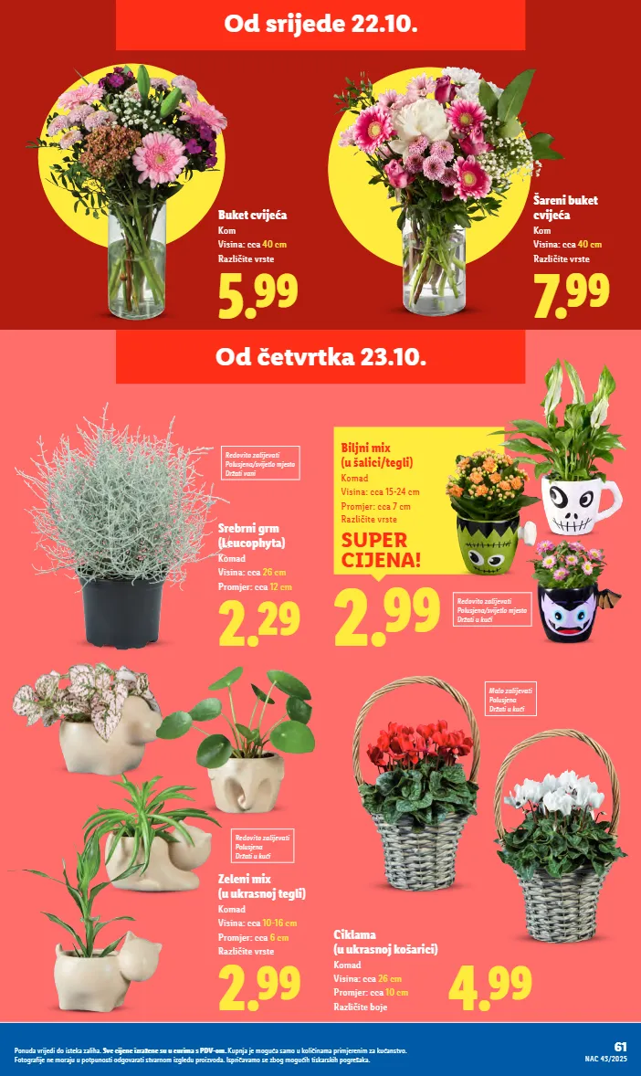 7.99 Šareni buket cvijeća Kom Visina: cca 40 cm Različite vrste Od četvrtka 23.10. Ponuda vrijedi do isteka zaliha. Sve cijene izražene su u eurima s PDV-om. Kupnja je moguća samo u količinama primjerenim za kućanstvo. Fotografije ne moraju u potpunosti odgovarati stvarnom izgledu proizvoda. Ispričavamo se zbog mogućih tiskarskih pogrešaka. Od srijede 22.10. 2.29 Srebrni grm (Leucophyta) Komad Visina: cca 26 cm Promjer: cca 12 cm Redovito zalijevati Polusjena/svijetlo mjesto Držati vani 2.99 Zeleni mix (u ukrasnoj tegli) Komad Visina: cca 10-16 cm Promjer: cca 6 cm Različite vrste 4.99 Ciklama (u ukrasnoj košarici) Komad Visina: cca 26 cm Promjer: cca 10 cm Različite boje Malo zalijevati Polusjena Držati u kući 5.99 Buket cvijeća Kom Visina: cca 40 cm Različite vrste Redovito zalijevati Polusjena Držati u kući 61 NAC 43/2025 Ponuda vrijedi do isteka zaliha. Sve cijene izražene su u eurima s PDV-om. Kupnja je moguća samo u količinama primjerenim za kućanstvo. Fotografije ne moraju u potpunosti odgovarati stvarnom izgledu proizvoda. Ispričavamo se zbog mogućih tiskarskih pogrešaka. Redovito zalijevati Polusjena/svijetlo mjesto Držati u kući 2.99 SUPER CIJENA! Biljni mix (u šalici/tegli) Komad Visina: cca 15-24 cm Promjer: cca 7 cm Različite vrste