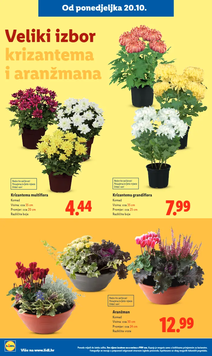 Ponuda vrijedi do isteka zaliha. Sve cijene izražene su u eurima s PDV-om. Kupnja je moguća samo u količinama primjerenim za kućanstvo. Fotografije ne moraju u potpunosti odgovarati stvarnom izgledu proizvoda. Ispričavamo se zbog mogućih tiskarskih pogrešaka. Više na www.lidl.hr Veliki izbor krizantema i aranžmana 12.99 Aranžman Komad Visina: cca 30 cm Promjer: cca 24 cm Različite vrste Redovito zalijevati Polusjena/svijetlo mjesto Držati vani Redovito zalijevati Polusjena/svijetlo mjesto Držati vani Redovito zalijevati Polusjena/svijetlo mjesto Držati vani 4.44 Krizantema multiflora Komad Visina: cca 35 cm Promjer: cca 20 cm Različite boje 7.99 Krizantema grandiflora Komad Visina: cca 35 cm Promjer: cca 25 cm Različite boje Od ponedjeljka 20.10.