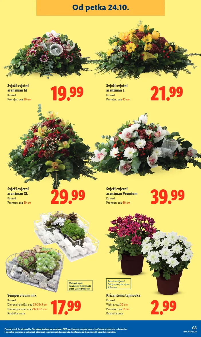 63 NAC 43/2025 Ponuda vrijedi do isteka zaliha. Sve cijene izražene su u eurima s PDV-om. Kupnja je moguća samo u količinama primjerenim za kućanstvo. Fotografije ne moraju u potpunosti odgovarati stvarnom izgledu proizvoda. Ispričavamo se zbog mogućih tiskarskih pogrešaka. Od petka 24.10. 17.99 Sempervivum mix Komad Dimenzije križa: cca 25x35x5 cm Dimenzije srca: cca 29x30x5 cm Različite vrste Malo zalijevati Polusjena/svijetlo mjesto Držati u kući/držati vani 2.99 Krizantema tajmovka Komad Visina: cca 30 cm Promjer: cca 12 cm Različite boje Redovito zalijevati Polusjena/svijetlo mjesto Držati vani 39.99 Svježi cvjetni aranžman Premium Komad Promjer: cca 60 cm 21.99 Svježi cvjetni aranžman L Komad Promjer: cca 45 cm 19.99 Svježi cvjetni aranžman M Komad Promjer: cca 30 cm 29.99 Svježi cvjetni aranžman XL Komad Promjer: cca 50 cm