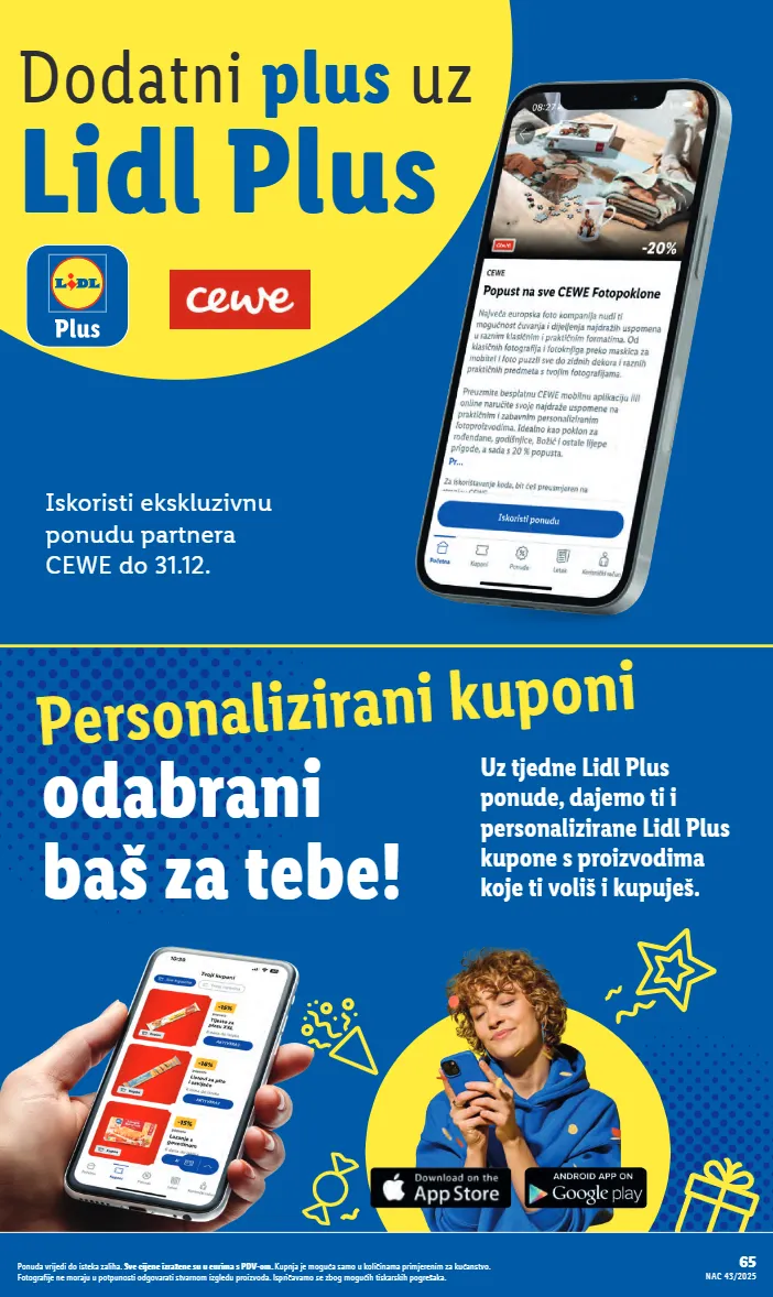Dodatni plus uz Lidl Plus Iskoristi ekskluzivnu ponudu partnera CEWE do 31.12. Personalizirani kuponi odabrani baš za tebe! Uz tjedne Lidl Plus ponude, dajemo ti i personalizirane Lidl Plus kupone s proizvodima koje ti voliš i kupuješ. 65 NAC 43/2025 Ponuda vrijedi do isteka zaliha. Sve cijene izražene su u eurima s PDV-om. Kupnja je moguća samo u količinama primjerenim za kućanstvo. Fotografije ne moraju u potpunosti odgovarati stvarnom izgledu proizvoda. Ispričavamo se zbog mogućih tiskarskih pogrešaka.