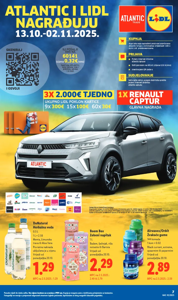 1.29 mpc na 2.5.2025.: 1.29 donatural herbalna voda 0.5 l 1 l = 2.58 menta, limunska trava ili aloe vera povratna naknada uključena je u cijenu vrijedi od ponedjeljka 20.10. 2.29 mpc na 2.5.2025.: 2.49 ili 2.79 boom box zobeni napitak 1 l badem, lješnjak, riža noisette ili barista vrijedi od ponedjeljka 20.10. 2.89 mpc na 2.5.2025.: 2.59 airwaves/orbit žvakaće gume 144 komada 1 kom = 0.02 black currant, extreme, spearmint ili pepermint vrijedi od ponedjeljka 20.10. 7 nac 43/2025 ponuda vrijedi do isteka zaliha. sve cijene izražene su u eurima s pdv-om. kupnja je moguća samo u količinama primjerenim za kućanstvo. fotografije ne moraju u potpunosti odgovarati stvarnom izgledu proizvoda. ispričavamo se zbog mogućih tiskarskih pogrešaka.