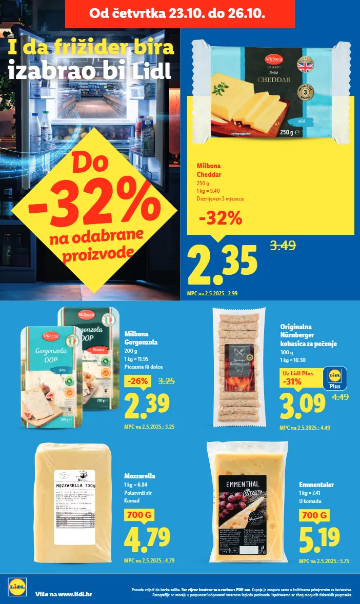 i da frižider bira izabrao bi lidl 5.19 700 g mpc na 2.5.2025.: 5.75 emmentaler 1 kg = 7.41 u komadu 4.79 700 g mpc na 2.5.2025.: 4.79 mozzarella 1 kg = 6.84 polutvrdi sir komad originalna nürnberger kobasica za pečenje 300 g 1 kg = 10.30 2.39 -26% 3.25 mpc na 2.5.2025.: 3.25 milbona gorgonzola 200 g 1 kg = 11.95 piccante ili dolce 2.35 3.49 milbona cheddar 250 g 1 kg = 9.40 dozrijevan 3 mjeseca mpc na 2.5.2025.: 2.99 -32% do -32% na odabrane proizvode 4.49 3.09 -31% uz lidl plus mpc na 2.5.2025.: 4.49 ponuda vrijedi do isteka zaliha. sve cijene izražene su u eurima s pdv-om. kupnja je moguća samo u količinama primjerenim za kućanstvo. fotografije ne moraju u potpunosti odgovarati stvarnom izgledu proizvoda. ispričavamo se zbog mogućih tiskarskih pogrešaka. više na www.lidl.hr od četvrtka 23.10. do 26.10.