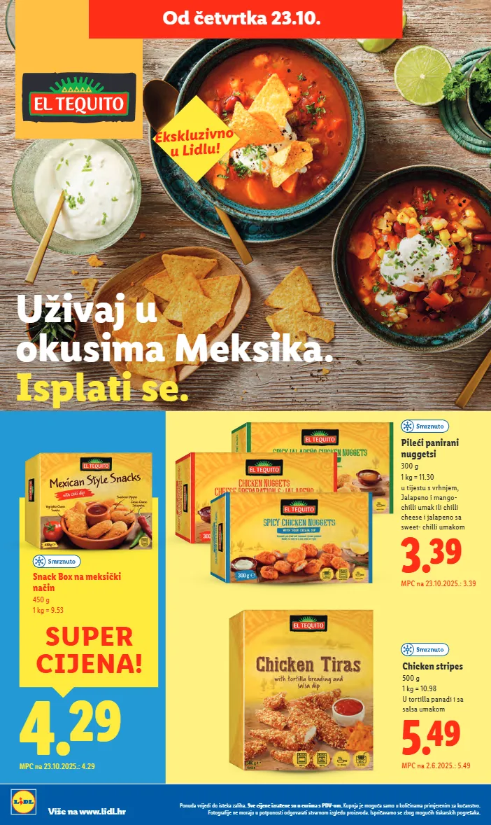 5.49 mpc na 2.6.2025.: 5.49 chicken stripes 500 g 1 kg = 10.98 u tortilla panadi i sa salsa umakom uživaj u okusima meksika. isplati se. ekskluzivno u lidlu! 3.39 mpc na 23.10.2025.: 3.39 pileći panirani nuggetsi 300 g 1 kg = 11.30 u tijestu s vrhnjem, jalapeno i mango- chilli umak ili chilli cheese i jalapeno sa sweet- chilli umakom 4.29 mpc na 23.10.2025.: 4.29 super cijena! snack box na meksički način 450 g 1 kg = 9.53 ponuda vrijedi do isteka zaliha. sve cijene izražene su u eurima s pdv-om. kupnja je moguća samo u količinama primjerenim za kućanstvo. fotografije ne moraju u potpunosti odgovarati stvarnom izgledu proizvoda. ispričavamo se zbog mogućih tiskarskih pogrešaka. više na www.lidl.hr od četvrtka 23.10.