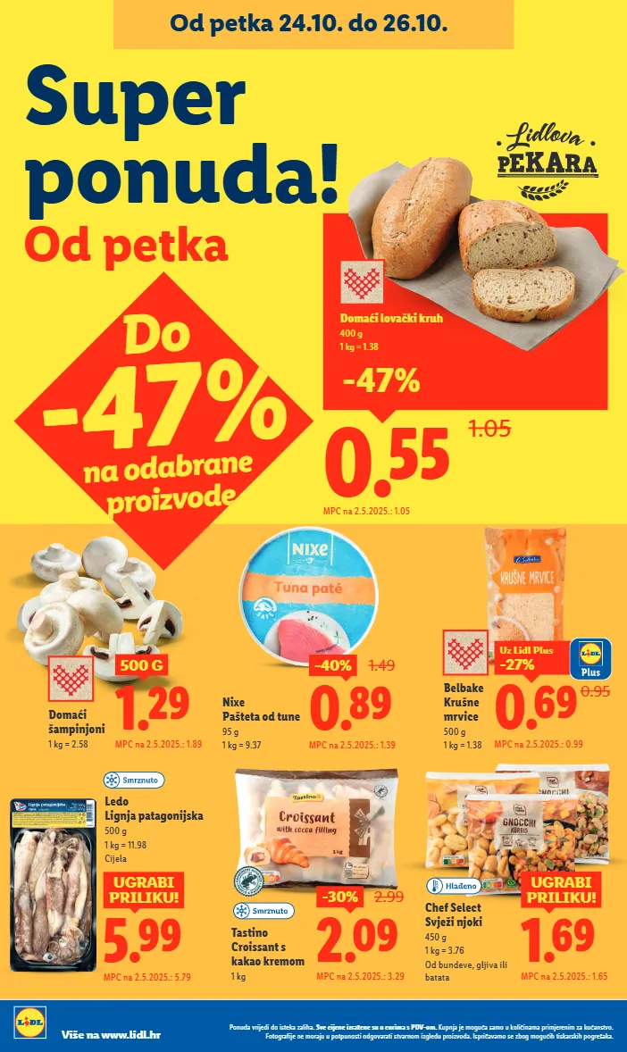 super ponuda! od petka 0.55 1.05 mpc na 2.5.2025.: 1.05 -47% domaći lovački kruh 400 g 1 kg = 1.38 do -47% na odabrane proizvode ledo lignja patagonijska 500 g 1 kg = 11.98 cijela 0.95 0.69 -27% uz lidl plus mpc na 2.5.2025.: 0.99 belbake krušne mrvice 500 g 1 kg = 1.38 1.69 ugrabi priliku! mpc na 2.5.2025.: 1.65 chef select svježi njoki 450 g 1 kg = 3.76 od bundeve, gljiva ili batata 5.99 ugrabi priliku! mpc na 2.5.2025.: 5.79 0.89 -40% 1.49 mpc na 2.5.2025.: 1.39 nixe pašteta od tune 95 g 1 kg = 9.37 2.09 -30% 2.99 mpc na 2.5.2025.: 3.29 tastino croissant s kakao kremom 1 kg 1.29 500 g mpc na 2.5.2025.: 1.89 domaći šampinjoni 1 kg = 2.58 ponuda vrijedi do isteka zaliha. sve cijene izražene su u eurima s pdv-om. kupnja je moguća samo u količinama primjerenim za kućanstvo. fotografije ne moraju u potpunosti odgovarati stvarnom izgledu proizvoda. ispričavamo se zbog mogućih tiskarskih pogrešaka. više na www.lidl.hr od petka 24.10. do 26.10.
