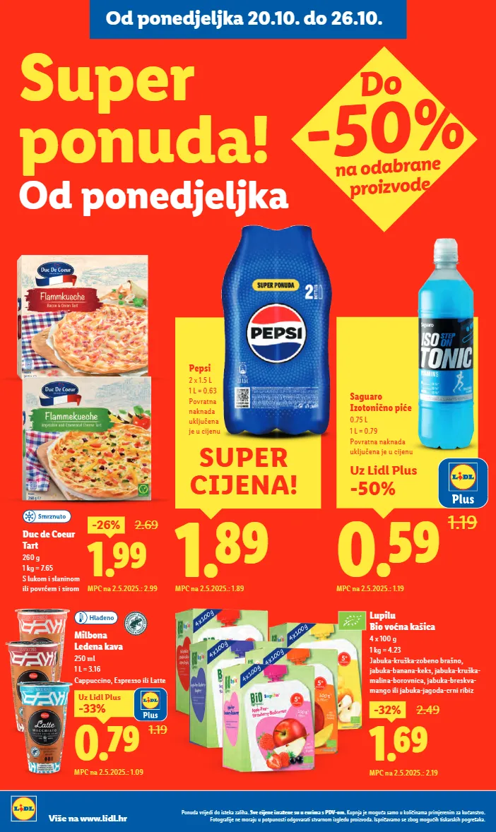 super ponuda! od ponedjeljka do -50% na odabrane proizvode uz lidl plus -50% 0.59 1.19 saguaro izotonično piće 0.75 l 1 l = 0.79 povratna naknada uključena je u cijenu mpc na 2.5.2025.: 1.19 1.69 -32% 2.49 mpc na 2.5.2025.: 2.19 lupilu bio voćna kašica 4 x 100 g 1 kg = 4.23 jabuka-kruška-zobeno brašno, jabuka-banana-keks, jabuka-kruška- malina-borovnica, jabuka-breskva- mango ili jabuka-jagoda-crni ribiz 1.99 -26% 2.69 mpc na 2.5.2025.: 2.99 duc de coeur tart 260 g 1 kg = 7.65 s lukom i slaninom ili povrćem i sirom milbona ledena kava 250 ml 1 l = 3.16 cappuccino, espresso ili latte 1.19 0.79 -33% uz lidl plus mpc na 2.5.2025.: 1.09 1.89 mpc na 2.5.2025.: 1.89 super cijena! pepsi 2 x 1.5 l 1 l = 0.63 povratna naknada uključena je u cijenu ponuda vrijedi do isteka zaliha. sve cijene izražene su u eurima s pdv-om. kupnja je moguća samo u količinama primjerenim za kućanstvo. fotografije ne moraju u potpunosti odgovarati stvarnom izgledu proizvoda. ispričavamo se zbog mogućih tiskarskih pogrešaka. više na www.lidl.hr od ponedjeljka 20.10. do 26.10.