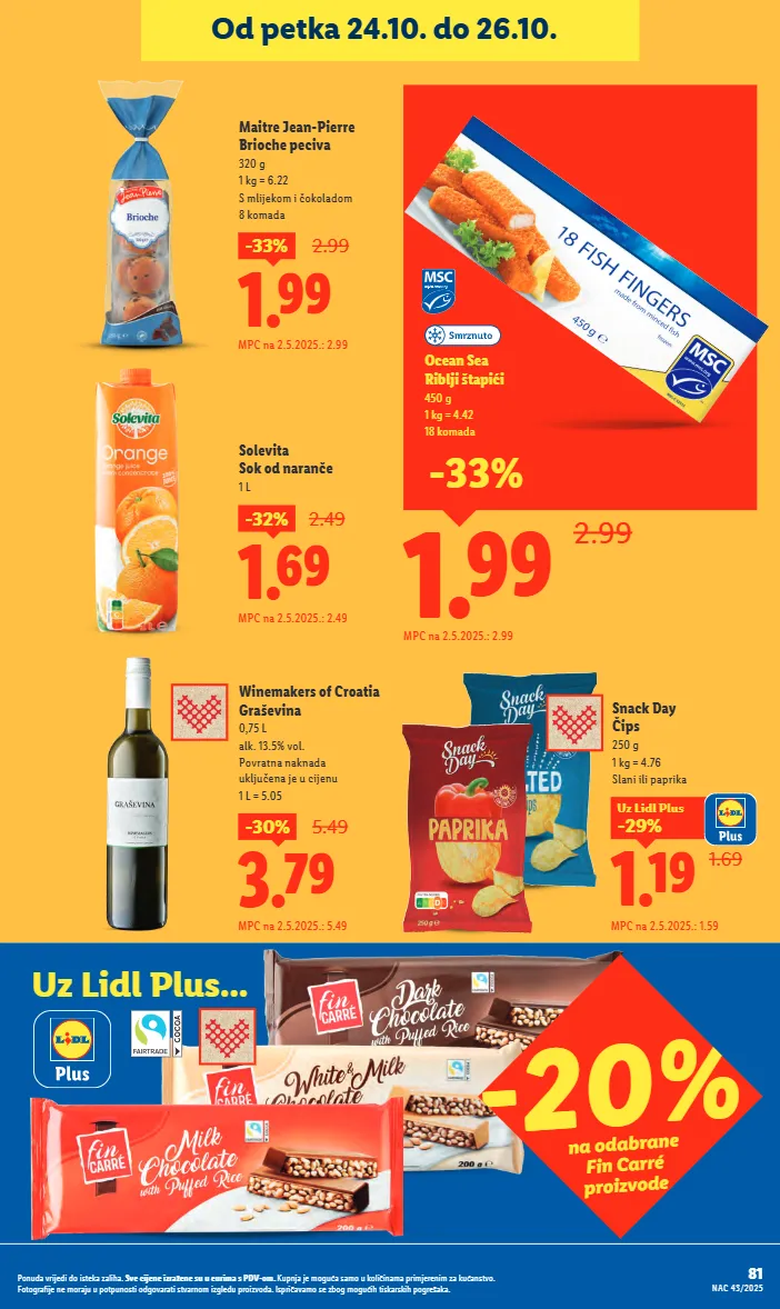 1.99 -33% 2.99 mpc na 2.5.2025.: 2.99 maitre jean-pierre brioche peciva 320 g 1 kg = 6.22 s mlijekom i čokoladom 8 komada 1.69 -32% 2.49 mpc na 2.5.2025.: 2.49 solevita sok od naranče 1 l 3.79 -30% 5.49 mpc na 2.5.2025.: 5.49 winemakers of croatia graševina 0,75 l alk. 13.5% vol. povratna naknada uključena je u cijenu 1 l = 5.05 1.69 1.19 -29% uz lidl plus mpc na 2.5.2025.: 1.59 snack day čips 250 g 1 kg = 4.76 slani ili paprika -20% na odabrane fin carré proizvode 1.99 2.99 ocean sea riblji štapići 450 g 1 kg = 4.42 18 komada mpc na 2.5.2025.: 2.99 -33% uz lidl plus... 81 nac 43/2025 ponuda vrijedi do isteka zaliha. sve cijene izražene su u eurima s pdv-om. kupnja je moguća samo u količinama primjerenim za kućanstvo. fotografije ne moraju u potpunosti odgovarati stvarnom izgledu proizvoda. ispričavamo se zbog mogućih tiskarskih pogrešaka. od petka 24.10. do 26.10.