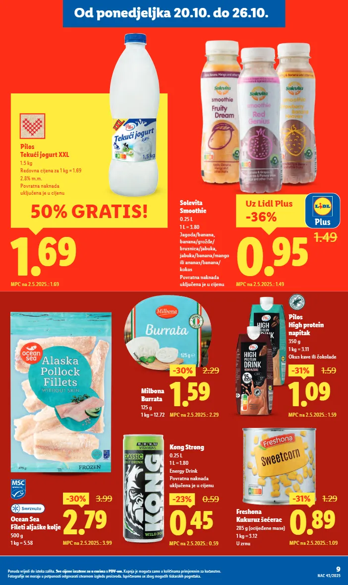 0.89 -31% 1.29 mpc na 2.5.2025.: 1.09 freshona kukuruz šećerac 285 g (ocijeđene mase) 1 kg = 3.12 u zrnu 1.59 -30% 2.29 mpc na 2.5.2025.: 2.29 milbona burrata 125 g 1 kg = 12.72 2.79 -30% 3.99 mpc na 2.5.2025.: 3.99 ocean sea fileti aljaške kolje 500 g 1 kg = 5.58 1.09 -31% 1.59 mpc na 2.5.2025.: 1.59 pilos high protein napitak 350 g 1 kg = 3.11 okus kave ili čokolade 0.45 -23% 0.59 mpc na 2.5.2025.: 0.59 kong strong 0.25 l 1 l = 1.80 energy drink povratna naknada uključena je u cijenu 1.69 mpc na 2.5.2025.: 1.69 50% gratis! pilos tekući jogurt xxl 1.5 kg redovna cijena za 1 kg = 1.69 2.8% m.m. povratna naknada uključena je u cijenu uz lidl plus -36% 0.95 1.49 mpc na 2.5.2025.: 1.49 solevita smoothie 0.25 l 1 l = 3.80 jagoda/banana, banana/grožđe/ brusnica/jabuka, jabuka/banana/mango ili ananas/banana/ kokos povratna naknada uključena je u cijenu 9 nac 43/2025 ponuda vrijedi do isteka zaliha. sve cijene izražene su u eurima s pdv-om. kupnja je moguća samo u količinama primjerenim za kućanstvo. fotografije ne moraju u potpunosti odgovarati stvarnom izgledu proizvoda. ispričavamo se zbog mogućih tiskarskih pogrešaka. od ponedjeljka 20.10. do 26.10.