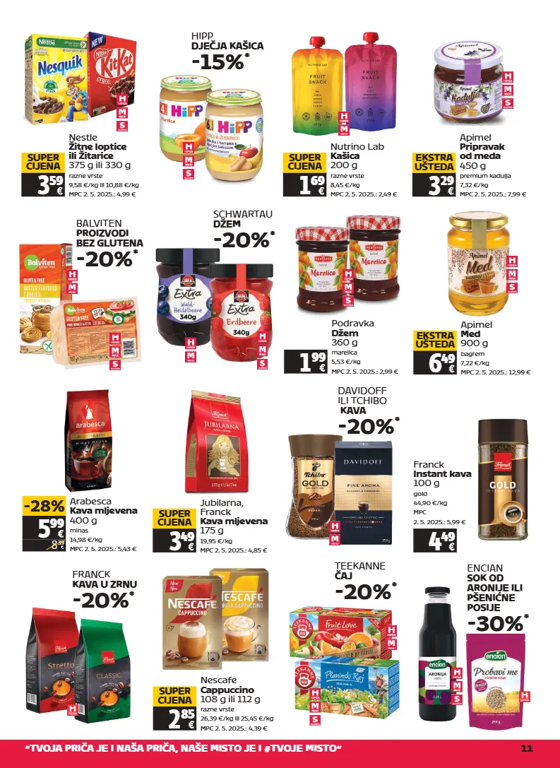 “tvoja priča je i naša priča, naše misto je i #tvoje misto“ 11 nestle žitne loptice ili žitarice 375 g ili 330 g razne vrste 9,58 €/kg ili 10,88 €/kg mpc 2. 5. 2025.: 4,99 € 3 59 super cijena hipp dječja kašica -15% * apimel med 900 g bagrem 7,22 €/kg mpc 2. 5. 2025.: 12,99 € 6 49 ekstra ušteda apimel pripravak od meda 450 g premium kadulja 7,32 €/kg mpc 2. 5. 2025.: 7,99 € 3 29 ekstra ušteda 5 99 8 39 -28% arabesca kava mljevena 400 g minas 14,98 €/kg mpc 2. 5. 2025.: 5,43 € jubilarna, franck kava mljevena 175 g 19,95 €/kg mpc 2. 5. 2025.: 4,85 € 3 49 super cijena franck kava u zrnu -20% * franck instant kava 100 g gold 44,90 €/kg mpc 2. 5. 2025.: 5,99 € 4 49 encian sok od aronije ili pšenićne posije -30% * 1 99 podravka džem 360 g marelica 5,53 €/kg mpc 2. 5. 2025.: 2,99 € schwartau džem -20% * davidoff ili tchibo kava -20% * teekanne čaj -20% * balviten proizvodi bez glutena -20% * nescafe cappuccino 108 g ili 112 g razne vrste 26,39 €/kg ili 25,45 €/kg mpc 2. 5. 2025.: 4,39 € 2 85 super cijena nutrino lab kašica 200 g razne vrste 8,45 €/kg mpc 2. 5. 2025.: 2,49 € 1 69 super cijena