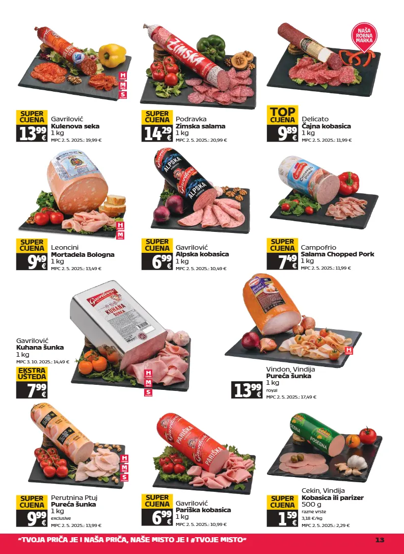 “tvoja priča je i naša priča, naše misto je i #tvoje misto“ 13 gavrilović kulenova seka 1 kg mpc 2. 5. 2025.: 19,99 € 13 99 super cijena podravka zimska salama 1 kg mpc 2. 5. 2025.: 20,99 € 14 29 super cijena delicato čajna kobasica 1 kg mpc 2. 5. 2025.: 11,99 € 9 89 top cijena vindon, vindija pureća šunka 1 kg royal mpc 2. 5. 2025.: 17,49 € 13 99 perutnina ptuj pureća šunka 1 kg exclusive mpc 2. 5. 2025.: 13,99 € 9 99 super cijena gavrilović kuhana šunka 1 kg mpc 3. 10. 2025.: 14,49 € 7 99 ekstra ušteda campofrio salama chopped pork 1 kg mpc 2. 5. 2025.: 11,99 € 7 49 super cijena gavrilović pariška kobasica 1 kg mpc 2. 5. 2025.: 10,99 € 6 99 super cijena gavrilović alpska kobasica 1 kg mpc 2. 5. 2025.: 10,49 € 6 99 super cijena leoncini mortadela bologna 1 kg mpc 2. 5. 2025.: 13,49 € 9 49 super cijena cekin, vindija kobasica ili parizer 500 g razne vrste 3,18 €/kg mpc 2. 5. 2025.: 2,29 € 1 59 super cijena