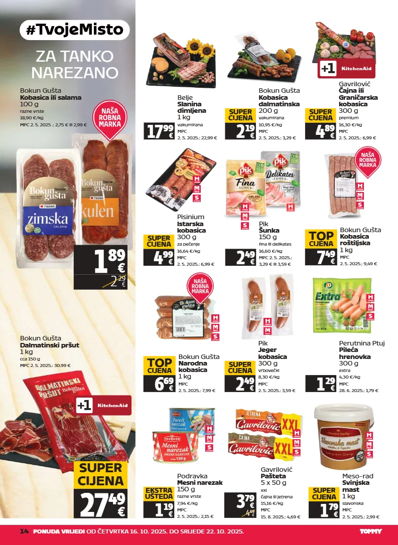 14 ponuda vrijedi od četvrtka 16. 10. 2025. do srijede 22. 10. 2025. za tanko narezano bokun gušta kobasica ili salama 100 g razne vrste 18,90 €/kg mpc 2. 5. 2025 .: 2,75 € ili 2,99 € 27 49 super cijena bokun gušta dalmatinski pršut 1 kg cca 150 g mpc 2. 5. 2025.: 30.99 € 1 89 2 29 pisinium istarska kobasica 300 g za pečenje 16,64 €/kg mpc 2. 5. 2025.: 6,99 € 4 99 super cijena pik šunka 150 g fina ili delikates 16,60 €/kg mpc 2. 5. 2025.: 3,29 € ili 3,59 € 2 49 perutnina ptuj pileća hrenovka 300 g extra 4,30 €/kg mpc 28. 6. 2025.: 1,79 € 1 29 podravka mesni narezak 150 g razne vrste 7,94 €/kg mpc 2. 5. 2025.: 2,15 € 1 19 ekstra ušteda meso-rad svinjska mast 1 kg slavonska mpc 2. 5. 2025.: 2,99 € 1 79 super cijena bokun gušta kobasica roštiljska 1 kg mpc 2. 5. 2025.: 9,49 € 7 49 top cijena bokun gušta narodna kobasica 1 kg mpc 2. 5. 2025.: 7,99 € 6 69 top cijena belje slanina dimljena 1 kg vakumirana mpc 2. 5. 2025.: 22,99 € 17 99 pik jeger kobasica 300 g vrbovečki 8,30 €/kg mpc 2. 5. 2025.: 3,59 € 2 49 super cijena gavrilović čajna ili graničarska kobasica 300 g premium 16,30 €/kg mpc 2. 5. 2025.: 6,99 € 4 89 super cijena gavrilović pašteta 5 x 50 g xxl čajna ili jetrena 15,16 €/kg mpc 15. 8. 2025.: 4,69 € 3 79 4 69 bokun gušta kobasica dalmatinska 200 g vakumirana 10,95 €/kg mpc 2. 5. 2025.: 3,29 € 2 19 super cijena