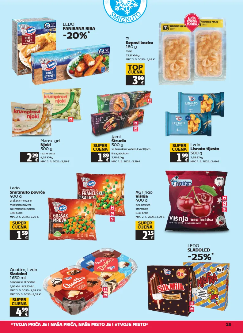 “tvoja priča je i naša priča, naše misto je i #tvoje misto“ 15 s m r z n u t o ledo panirana riba -20% * t! repovi kozica 180 g maxi 22,17 €/kg mpc 2. 5. 2025.: 5,49 € 3 99 top cijena marex-gel njoki 500 g razne vrste 4,58 €/kg mpc 2. 5. 2025.: 3,29 € 2 29 ledo smrznuto povrće 400 g grašak i mrkva ili miješano povrće za francusku salatu 3,98 €/kg mpc 2. 5. 2025.: 2,29 € 1 59 super cijena ag frigo višnja 400 g bez koštica smrznuta 5,38 €/kg mpc 2. 5. 2025.: 3,29 € 2 15 super cijena quattro, ledo sladoled 1650 ml happiness ili dorina 3,03 €/l ili 3,33 €/l mpc 2. 5. 2025.: 7,69 € ili mpc 20. 5. 2025.: 8,29 € 4 99 super cijena ledo lisnato tijesto 500 g 3,98 €/kg mpc 2. 5. 2025.: 2,49 € 1 99 super cijena ledo sladoled -25% * jami štrudla 500 g sa šumskim voćem i vanilijom ili sa jabukom 3,78 €/kg mpc 2. 5. 2025.: 3,29 € 1 89 super cijena