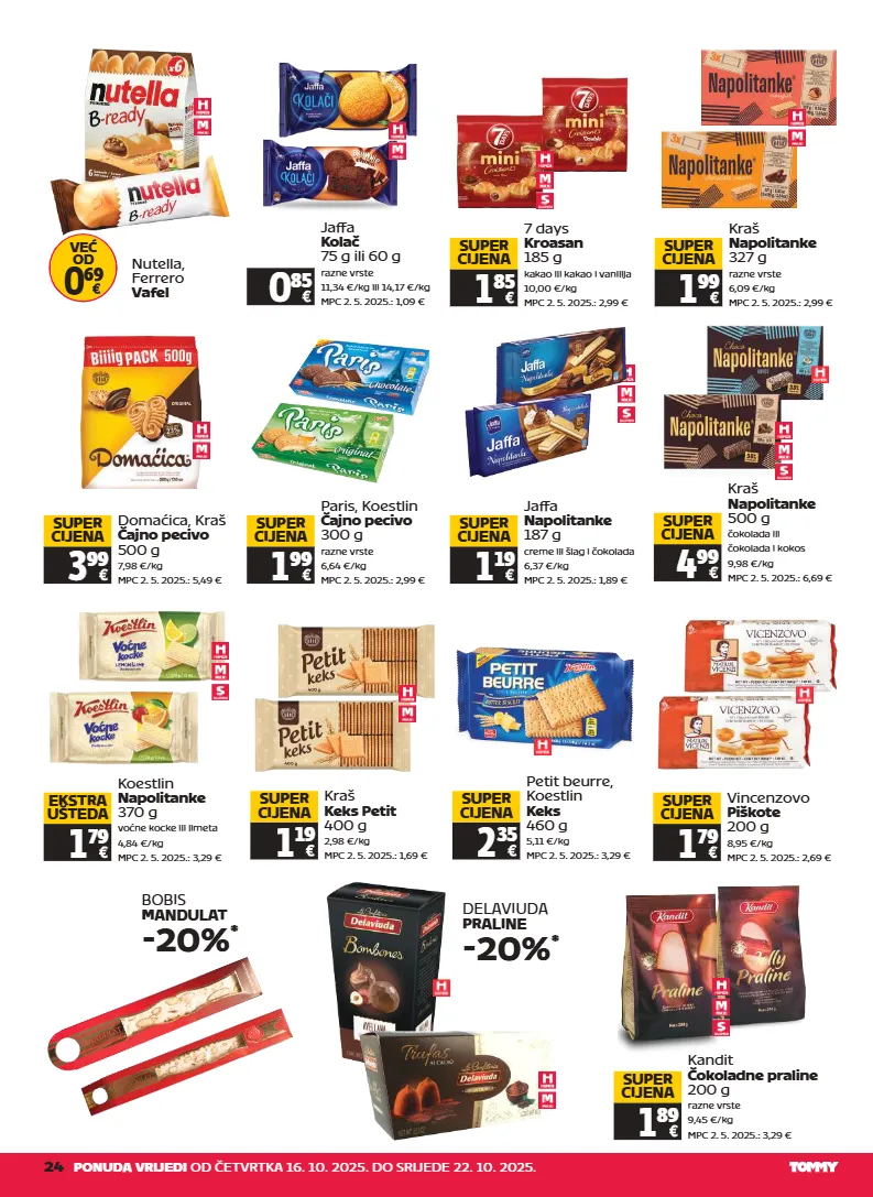 24 ponuda vrijedi od četvrtka 16. 10. 2025. do srijede 22. 10. 2025. 7 days kroasan 185 g kakao ili kakao i vanilija 10,00 €/kg mpc 2. 5. 2025.: 2,99 € 1 85 super cijena vincenzovo piškote 200 g 8,95 €/kg mpc 2. 5. 2025.: 2,69 € 1 79 super cijena kraš napolitanke 500 g čokolada ili čokolada i kokos 9,98 €/kg mpc 2. 5. 2025.: 6,69 € 4 99 super cijena jaffa napolitanke 187 g creme ili šlag i čokolada 6,37 €/kg mpc 2. 5. 2025.: 1,89 € 1 19 super cijena koestlin napolitanke 370 g voćne kocke ili limeta 4,84 €/kg mpc 2. 5. 2025.: 3,29 € 1 79 ekstra ušteda paris, koestlin čajno pecivo 300 g razne vrste 6,64 €/kg mpc 2. 5. 2025.: 2,99 € 1 99 super cijena petit beurre, koestlin keks 460 g 5,11 €/kg mpc 2. 5. 2025.: 3,29 € 2 35 super cijena kandit čokoladne praline 200 g razne vrste 9,45 €/kg mpc 2. 5. 2025.: 3,29 € 1 89 super cijena kraš napolitanke 327 g razne vrste 6,09 €/kg mpc 2. 5. 2025.: 2,99 € 1 99 super cijena domaćica, kraš čajno pecivo 500 g 7,98 €/kg mpc 2. 5. 2025.: 5,49 € 3 99 super cijena kraš keks petit 400 g 2,98 €/kg mpc 2. 5. 2025.: 1,69 € 1 19 super cijena delaviuda praline -20% * jaffa kolač 75 g ili 60 g razne vrste 11,34 €/kg ili 14,17 €/kg mpc 2. 5. 2025.: 1,09 € 0 85 nutella, ferrero vafel već od 0 69 bobis mandulat -20% *
