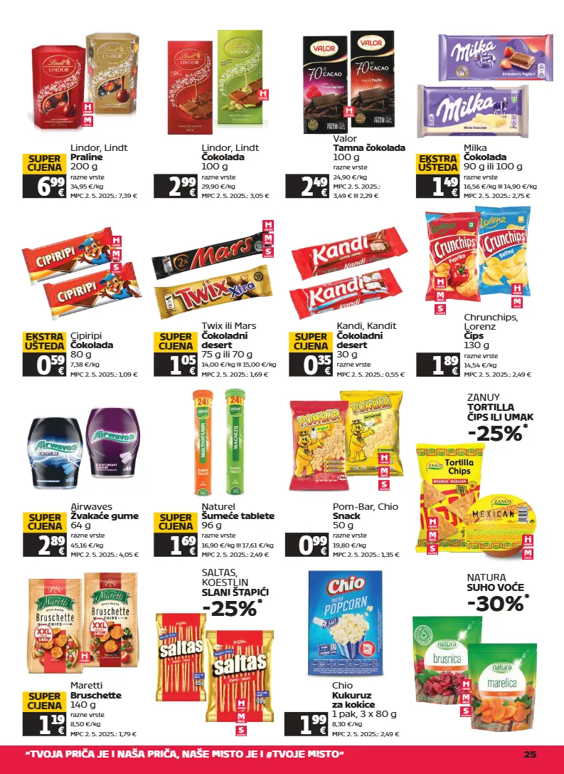 “tvoja priča je i naša priča, naše misto je i #tvoje misto“ 25 milka čokolada 90 g ili 100 g razne vrste 16,56 €/kg ili 14,90 €/kg mpc 2. 5. 2025.: 2,75 € 1 49 ekstra ušteda cipiripi čokolada 80 g 7,38 €/kg mpc 2. 5. 2025.: 1,09 € 0 59 ekstra ušteda twix ili mars čokoladni desert 75 g ili 70 g 14,00 €/kg ili 15,00 €/kg mpc 2. 5. 2025.: 1,69 € 1 05 super cijena kandi, kandit čokoladni desert 30 g razne vrste mpc 2. 5. 2025.: 0,55 € 0 35 super cijena airwaves žvakaće gume 64 g razne vrste 45,16 €/kg mpc 2. 5. 2025.: 4,05 € 2 89 super cijena zanuy tortilla čips ili umak -25% * pom-bar, chio snack 50 g razne vrste 19,80 €/kg mpc 2. 5. 2025.: 1,35 € 0 99 maretti bruschette 140 g razne vrste 8,50 €/kg mpc 2. 5. 2025.: 1,79 € 1 19 super cijena saltas, koestlin slani štapići -25% * chio kukuruz za kokice 1 pak, 3 x 80 g 8,30 €/kg mpc 2. 5. 2025.: 2,49 € 1 99 natura suho voće -30% * chrunchips, lorenz čips 130 g razne vrste 14,54 €/kg mpc 2. 5. 2025.: 2,49 € 1 89 naturel šumeće tablete 96 g razne vrste 16,90 €/kg ili 17,61 €/kg mpc 2. 5. 2025.: 2,49 € 1 69 super cijena lindor, lindt čokolada 100 g razne vrste 29,90 €/kg mpc 2. 5. 2025.: 3,05 € 2 99 valor tamna čokolada 100 g razne vrste 24,90 €/kg mpc 2. 5. 2025.: 3,49 € ili 2,29 € 2 49 lindor, lindt praline 200 g razne vrste 34,95 €/kg mpc 2. 5. 2025.: 7,39 € 6 99 super cijena