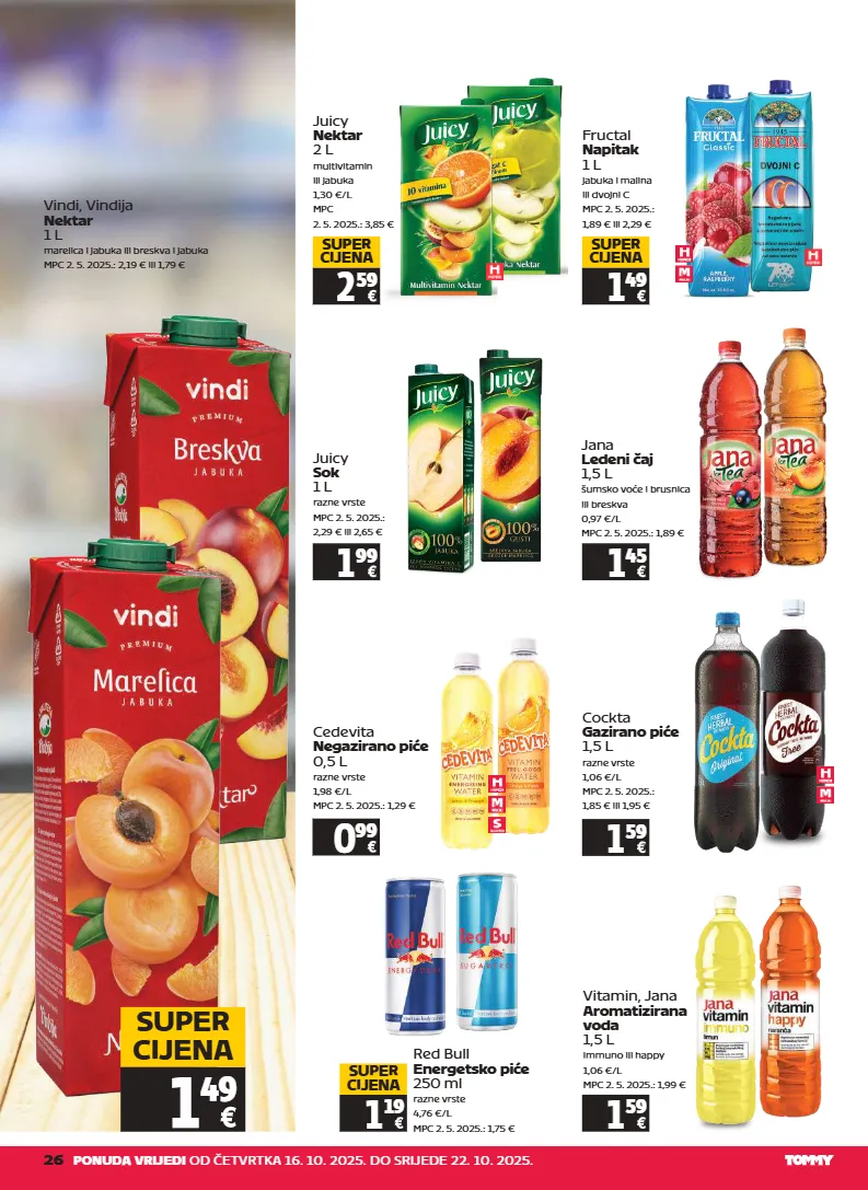 26 ponuda vrijedi od četvrtka 16. 10. 2025. do srijede 22. 10. 2025. vindi, vindija nektar 1 l marelica i jabuka ili breskva i jabuka mpc 2. 5. 2025.: 2,19 € ili 1,79 € 1 49 super cijena juicy nektar 2 l multivitamin ili jabuka 1,30 €/l mpc 2. 5. 2025.: 3,85 € 2 59 super cijena juicy sok 1 l razne vrste mpc 2. 5. 2025.: 2,29 € ili 2,65 € 1 99 jana ledeni čaj 1,5 l šumsko voće i brusnica ili breskva 0,97 €/l mpc 2. 5. 2025.: 1,89 € 1 45 cedevita negazirano piće 0,5 l razne vrste 1,98 €/l mpc 2. 5. 2025.: 1,29 € 0 99 cockta gazirano piće 1,5 l razne vrste 1,06 €/l mpc 2. 5. 2025.: 1,85 € ili 1,95 € 1 59 red bull energetsko piće 250 ml razne vrste 4,76 €/l mpc 2. 5. 2025.: 1,75 € 1 19 super cijena vitamin, jana aromatizirana voda 1,5 l immuno ili happy 1,06 €/l mpc 2. 5. 2025.: 1,99 € 1 59 fructal napitak 1 l jabuka i malina ili dvojni c mpc 2. 5. 2025.: 1,89 € ili 2,29 € 1 49 super cijena