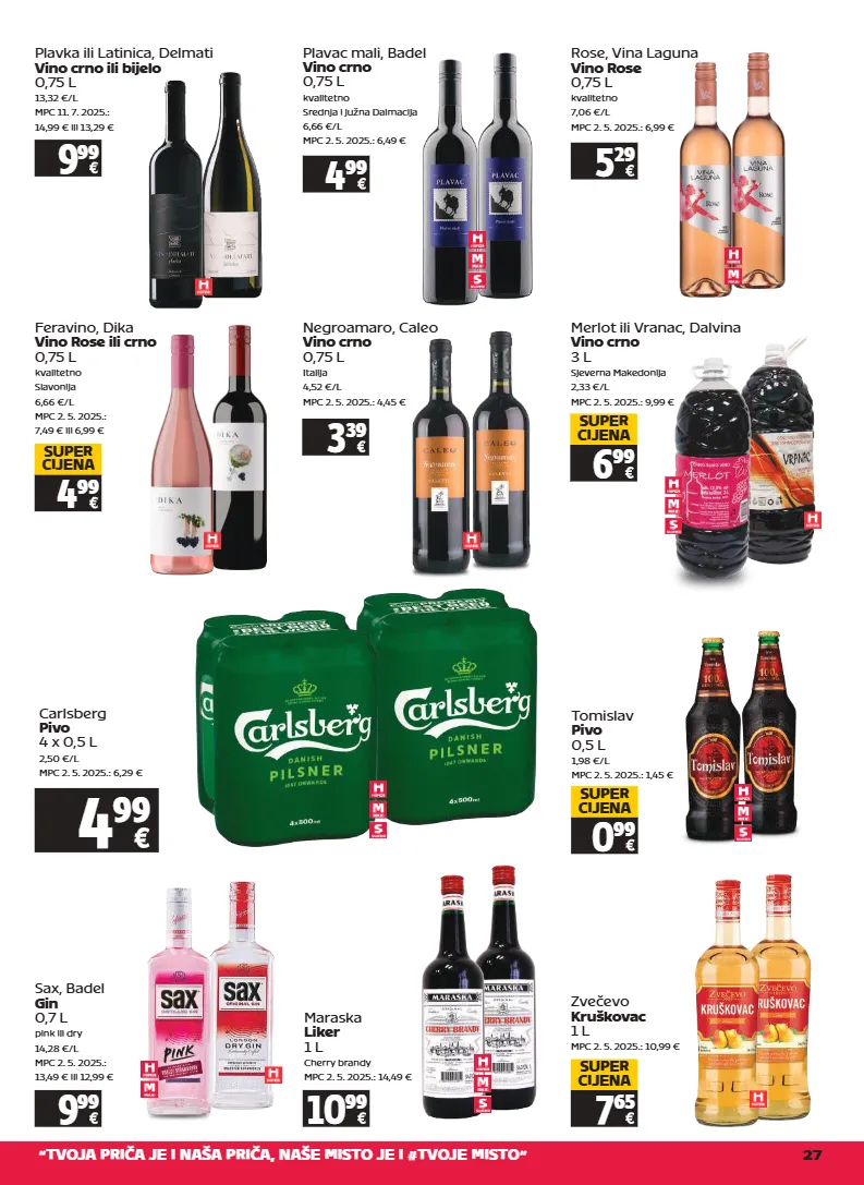 “tvoja priča je i naša priča, naše misto je i #tvoje misto“ 27 plavka ili latinica, delmati vino crno ili bijelo 0,75 l 13,32 €/l mpc 11. 7. 2025.: 14,99 € ili 13,29 € 9 99 plavac mali, badel vino crno 0,75 l kvalitetno srednja i južna dalmacija 6,66 €/l mpc 2. 5. 2025.: 6,49 € 4 99 rose, vina laguna vino rose 0,75 l kvalitetno 7,06 €/l mpc 2. 5. 2025.: 6,99 € 5 29 feravino, dika vino rose ili crno 0,75 l kvalitetno slavonija 6,66 €/l mpc 2. 5. 2025.: 7,49 € ili 6,99 € 4 99 super cijena negroamaro, caleo vino crno 0,75 l italija 4,52 €/l mpc 2. 5. 2025.: 4,45 € 3 39 merlot ili vranac, dalvina vino crno 3 l sjeverna makedonija 2,33 €/l mpc 2. 5. 2025.: 9,99 € 6 99 super cijena carlsberg pivo 4 x 0,5 l 2,50 €/l mpc 2. 5. 2025.: 6,29 € tomislav pivo 0,5 l 1,98 €/l mpc 2. 5. 2025.: 1,45 € 0 99 super cijena sax, badel gin 0,7 l pink ili dry 14,28 €/l mpc 2. 5. 2025.: 13,49 € ili 12,99 € 9 99 maraska liker 1 l cherry brandy mpc 2. 5. 2025.: 14,49 € 10 99 zvečevo kruškovac 1 l mpc 2. 5. 2025.: 10,99 € 7 65 super cijena 4 99