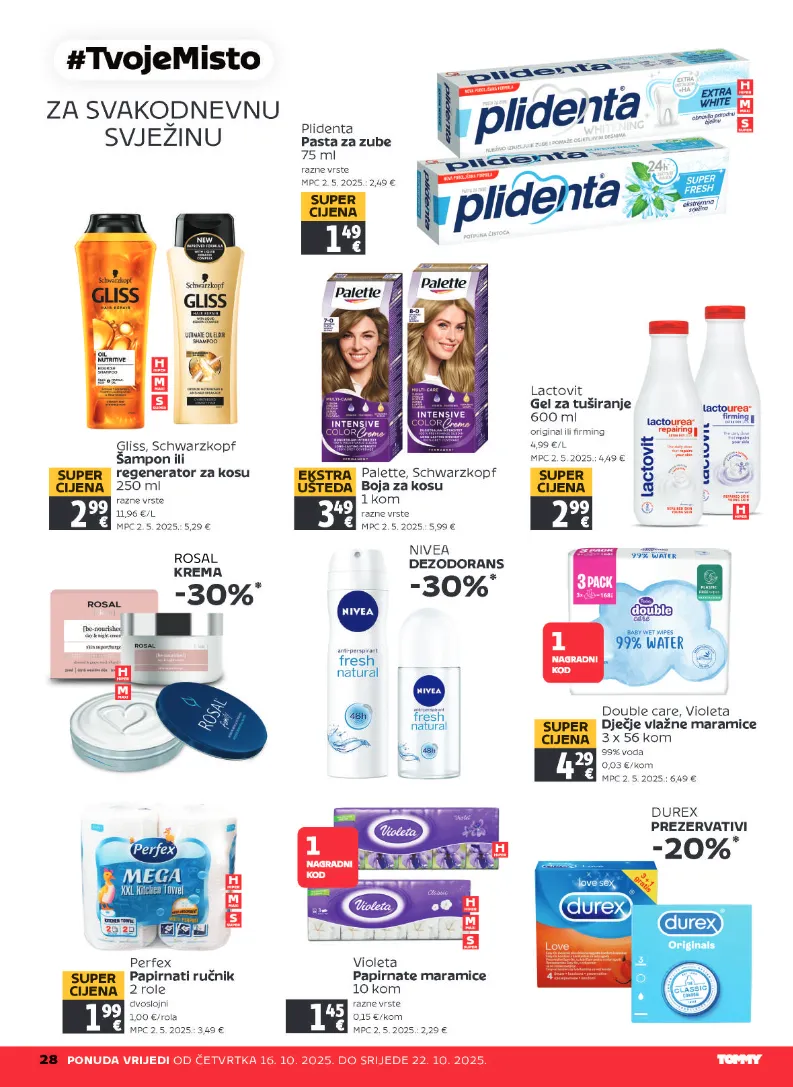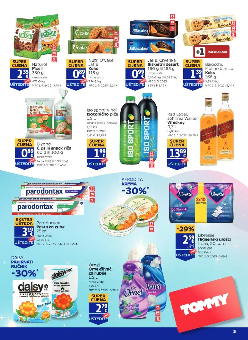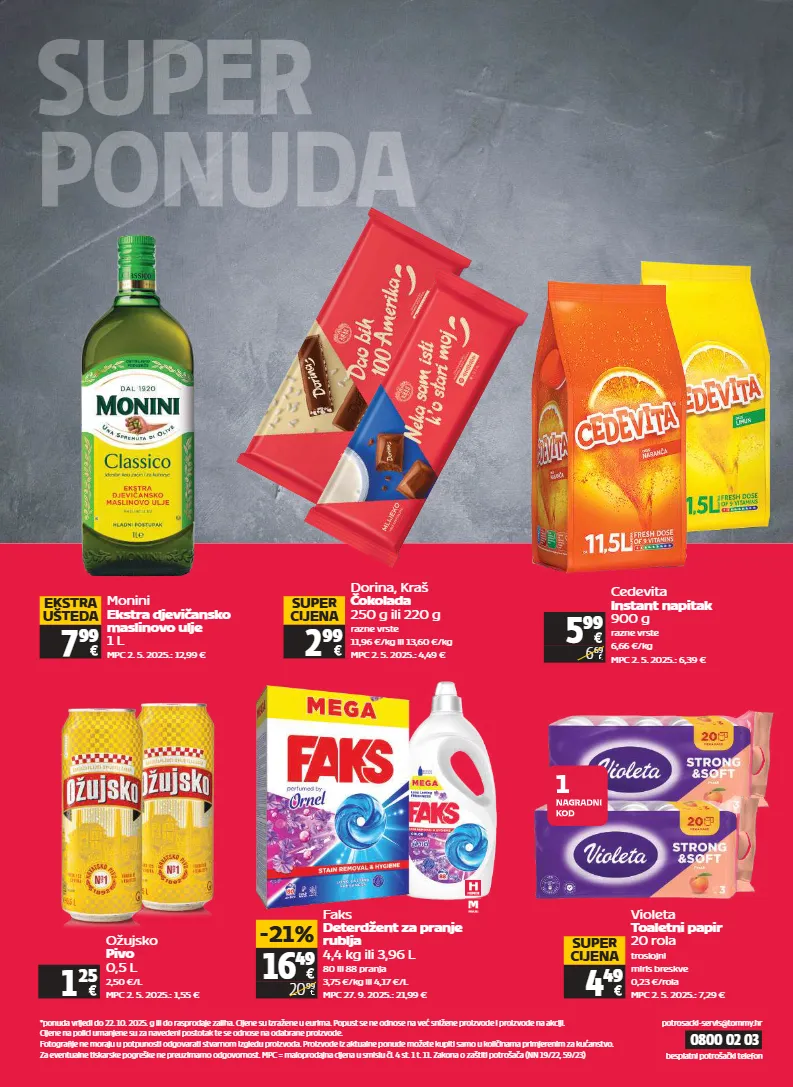 32 ponuda vrijedi od četvrtka 16. 10. 2025. do srijede 22. 10. 2025. 16 49 20 99 -21% 0800 02 03 *ponuda vrijedi do 22. 10. 2025. g ili do rasprodaje zaliha. cijene su izražene u eurima. popust se ne odnose na već snižene proizvode i proizvode na akciji. cijene na polici umanjene su za navedeni postotak te se odnose na odabrane proizvode. fotografije ne moraju u potpunosti odgovarati stvarnom izgledu proizvoda. proizvode iz aktualne ponude možete kupiti samo u količinama primjerenim za kućanstvo. za eventualne tiskarske pogreške ne preuzimamo odgovornost. mpc = maloprodajna cijena u smislu čl. 4 st. 1 t. 11. zakona o zaštiti potrošača (nn 19/22, 59/23) besplatni potrošački telefon potrosacki-servis@tommy.hr super ponuda monini ekstra djevičansko maslinovo ulje 1 l mpc 2. 5. 2025.: 12,99 € 7 99 ekstra ušteda dorina, kraš čokolada 250 g ili 220 g razne vrste 11,96 €/kg ili 13,60 €/kg mpc 2. 5. 2025.: 4,49 € 2 99 super cijena cedevita instant napitak 900 g razne vrste 6,66 €/kg mpc 2. 5. 2025.: 6,39 € 5 99 6 69 faks deterdžent za pranje rublja 4,4 kg ili 3,96 l 80 ili 88 pranja 3,75 €/kg ili 4,17 €/l mpc 27. 9. 2025.: 21,99 € violeta toaletni papir 20 rola troslojni miris breskve 0,23 €/rola mpc 2. 5. 2025.: 7,29 € 4 49 super cijena ožujsko pivo 0,5 l 2,50 €/l mpc 2. 5. 2025.: 1,55 € 1 25