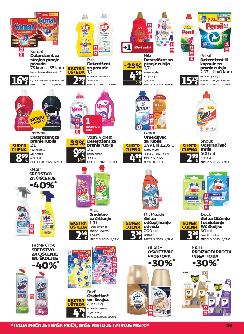 “tvoja priča je i naša priča, naše misto je i #tvoje misto“ 29 9 99 14 99 -33% 4 59 5 99 -23% 16 49 somat deterdžent za strojno pranje posuđa 75 kom ili 65 kom kapsule excellence 4 u 1 ili 5 u 1 0,22 €/kom ili 0,26 €/kom mpc 2. 5. 2025.: 33,99 € pur deterdžent za posuđe 1,2 l limun ili aloe vera 2,50 €/l mpc 2. 5. 2025.: 5,29 € 2 99 ekstra ušteda nila deterdžent za pranje rublja 2,7 l razne vrste 50 pranja 1,70 €/l mpc 2. 5. 2025.: 9,99 € perwoll deterdžent za pranje rublja 2 l razne vrste 40 pranja 4,50 €/l mpc 10. 10. 2025.: 12,99 € 8 99 super cijena vesh, violeta deterdžent za pranje rublja 3 l razne vrste 3,33 €/l mpc 2. 5. 2025.: 18,99 € lenor omekšivač za rublje 1,49 l ili 1,239 l razne vrste 3,35 €/l ili 4,03 €/l mpc 2. 5. 2025.: 8,29 € ili 8,99 € 4 99 super cijena shout odstranjivač mrlja 500 ml 5,98 €/l mpc 2. 5. 2025.: 4,99 € 2 99 super cijena mr. muscle gel za odčepljivanje odvoda 500 ml 6,38 €/l mpc 2. 5. 2025.: 4,39 € 3 19 super cijena duck gel za čišćenje i osvježenje wc školjke 36 ml lime ili marine mpc 2. 5. 2025.: 5,29 € 3 39 super cijena domestos sredstvo za čišćenje wc školjke -40% * bref osvježivač wc školjke 4 x 50 g limun ili cvijeće 23,95 €/kg mpc 2. 5. 2025.: 8,99 € 4 79 ekstra ušteda persil deterdžent ili kapsule za pranje rublja 2,97 l ili 40 kom 66 ili 40 pranja 5,15 €/l ili 0,39 €/kom mpc 2. 5. 2025.: 24,99 € 15 29 smac sredstvo za čišćenje -40% * ajax sredstvo za čišćenje 1,5 l floral fiesta ili spring flowers 1,66 €/l mpc 2. 5. 2025.: 4,29 € 2 49 ekstra ušteda glade osvježivač prostora -30% * raid proizvodi protiv insekticida -30% *