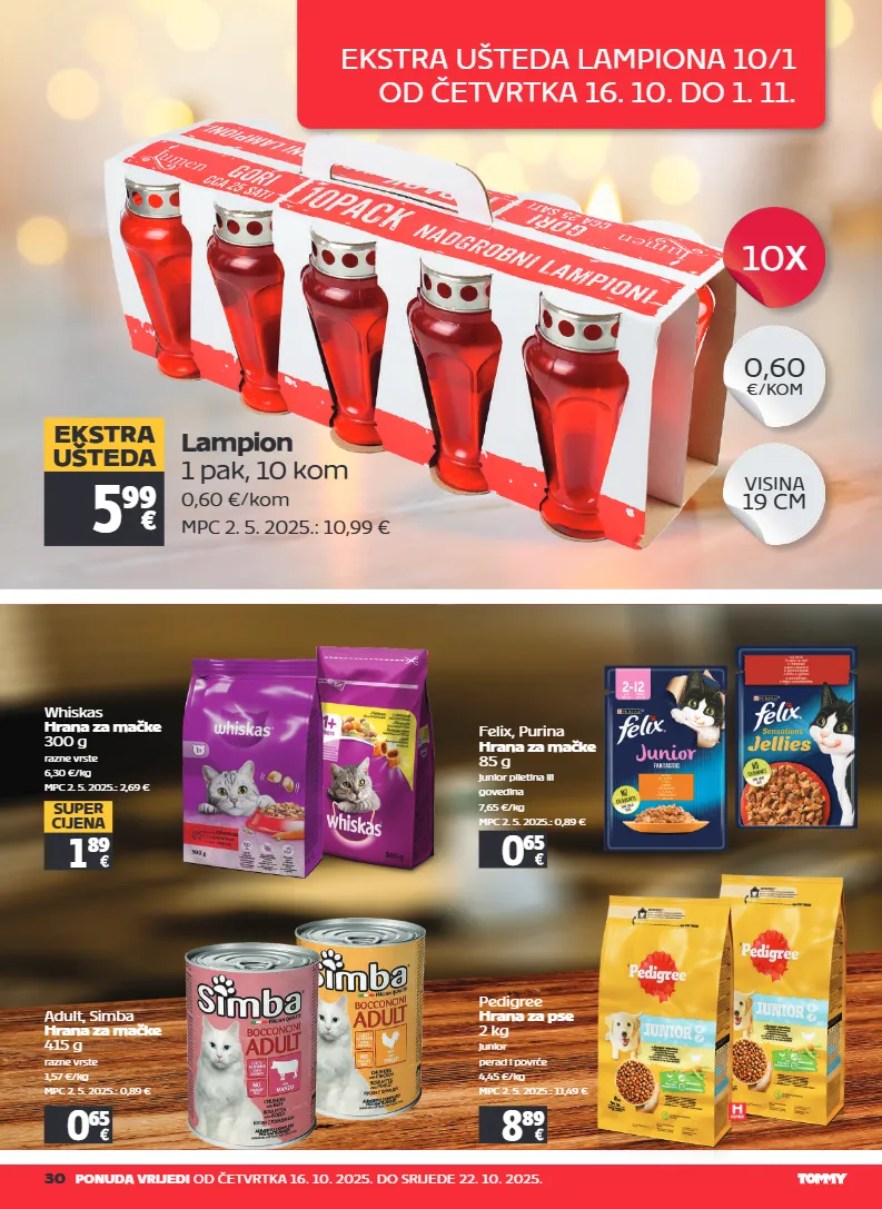 30 ponuda vrijedi od četvrtka 16. 10. 2025. do srijede 22. 10. 2025. whiskas hrana za mačke 300 g razne vrste 6,30 €/kg mpc 2. 5. 2025.: 2,69 € felix, purina hrana za mačke 85 g junior piletina ili govedina 7,65 €/kg mpc 2. 5. 2025.: 0,89 € 1 89 super cijena 0 65 pedigree hrana za pse 2 kg junior perad i povrće 4,45 €/kg mpc 2. 5. 2025.: 11,49 € 8 89 lampion 1 pak, 10 kom 0,60 €/kom mpc 2. 5. 2025.: 10,99 € ekstra ušteda 5 99 € ekstra ušteda lampiona 10/1 od četvrtka 16. 10. do 1. 11. 10 x 0,60 €/kom visina 19 cm adult, simba hrana za mačke 415 g razne vrste 1,57 €/kg mpc 2. 5. 2025.: 0,89 € 0 65
