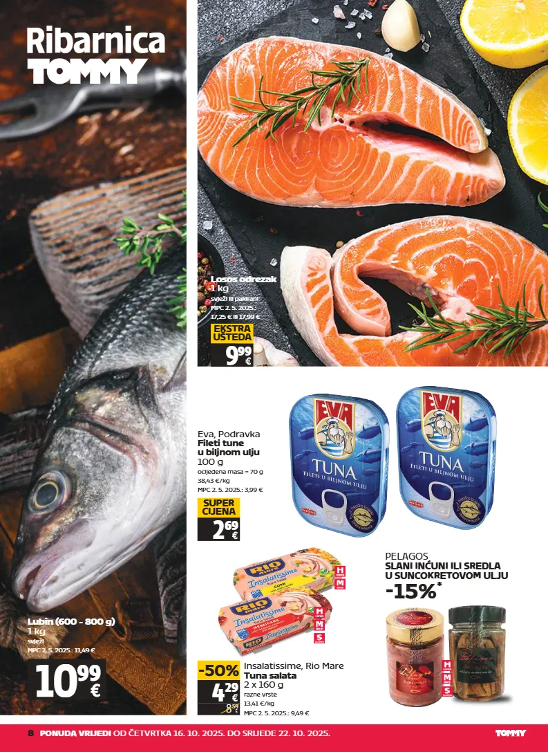 8 ponuda vrijedi od četvrtka 16. 10. 2025. do srijede 22. 10. 2025. ribarnica eva, podravka fileti tune u biljnom ulju 100 g ocijeđena masa = 70 g 38,43 €/kg mpc 2. 5. 2025.: 3,99 € 2 69 super cijena insalatissime, rio mare tuna salata 2 x 160 g razne vrste 13,41 €/kg mpc 2. 5. 2025.: 9,49 € 4 29 8 59 -50% pelagos slani inćuni ili sredla u suncokretovom ulju -15% * losos odrezak 1 kg svježi ili pakirani mpc 2. 5. 2025.: 17,25 € ili 17,99 € 9 99 ekstra ušteda lubin (600 - 800 g) 1 kg svježi mpc 2. 5. 2025.: 11,49 € 10 99