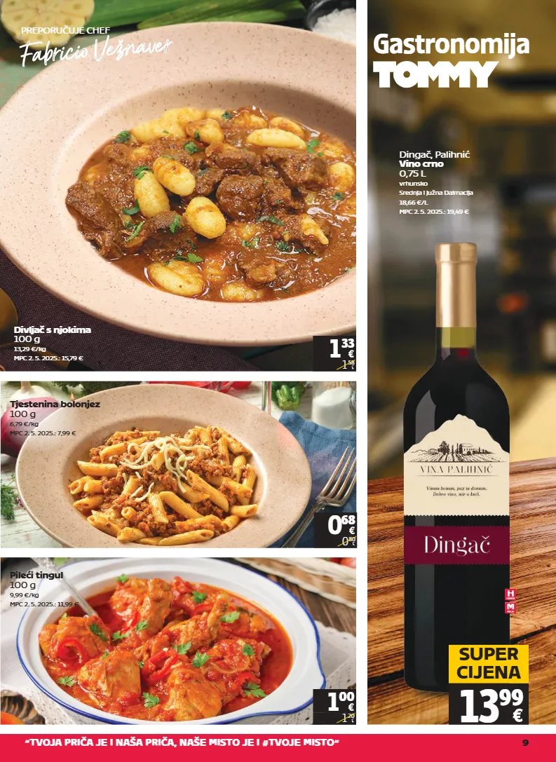“tvoja priča je i naša priča, naše misto je i #tvoje misto“ 9 gastronomija dingač, palihnić vino crno 0,75 l vrhunsko srednja i južna dalmacija 18,66 €/l mpc 2. 5. 2025.: 19,49 € 13 99 super cijena divljač s njokima 100 g 13,29 €/kg mpc 2. 5. 2025.: 15,79 € preporučuje chef 1 33 1 58 0 68 0 80 1 00 1 20 pileći tingul 100 g 9,99 €/kg mpc 2. 5. 2025.: 11,99 € tjestenina bolonjez 100 g 6,79 €/kg mpc 2. 5. 2025.: 7,99 €