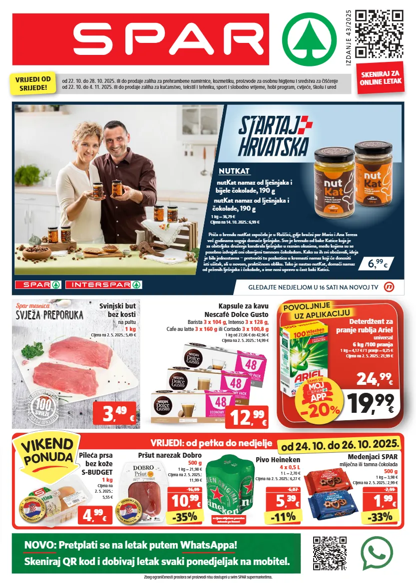 od 24. 10. do 26. 10. 2025. vrijedi: od petka do nedjelje novo: pretplati se na letak putem whatsappa! skeniraj qr kod i dobivaj letak svake srijede na mobitel. novo: pretplati se na letak putem whatsappa! skeniraj qr kod i dobivaj letak svaki ponedjeljak na mobitel. svje ž a preporuka spar mesnica svinjski but bez kosti na pultu 1 kg cijena na 2. 5. 2025.: 5,49 € v i k e n d p o n u d a medenjaci spar mliječna ili tamna čokolada 500 g 1 kg = 3,98 € cijena na 2. 5. 2025.: 2,99 € pileća prsa bez kože s-budget 1 kg cijena na 2. 5. 2025.: 5,55 € pršut narezak dobro 500 g 1 kg = 21,98 € cijena na 2. 5. 2025.: 11,99 € pivo heineken 4 x 0,5 l 1 l = 2,70 € cijena na 2. 5. 2025.: 6,27 € kapsule za kavu nescafé dolce gusto barista 3 x 104 g , intenso 3 x 128 g , cafe au latte 3 x 160 g ili cortado 3 x 100,8 g 1 kg od 27,06 € do 42,96 € cijena na 2. 5. 2025.: 14,99 € 4 , 99 99 € -33% -33% 2,99 1 , 99 99 € h r v a t s k a k v a l i t e t a h r v a t s k a k v a l i t e t a h r v a t s k a k v a l i t e t a h r v a t s k a k v a l i t e t a -35% -35% 16,99 € 10 , 99 99 € 12 , 99 99 € 3 , 49 49 -11% -11% 6,07 5 , 39 39 € 24 , 99 € 19 , 99 € -20 % samo uz deterdžent za pranje rublja ariel universal 6 kg /100 pranja 1 kg = 4,17 € / 1 pranje = 0,25 € cijena na 2. 5. 2025.: 21,99 € povoljnije uz aplikac iju u cijenu uključena povratna naknada po limenci nutkat nutkat namaz od lješnjaka i bijele čokolade, 190 g nutkat namaz od lješnjaka i čokolade, 190 g 1 kg = 36,79 € cijena na 14. 10. 2025.: 6,99 € priča o brendu nutkat započela je u ruščici, gdje bračni par mario i ana tereza već godinama uzgaja domaće lješnjake. sve je krenulo od bake katice koja je za obiteljska druženja kandirala lješnjake u raznim okusima, među kojima su se posebno izdvajali oni obavijeni tamnom čokoladom. kako su ih svi obožavali, ideja je bila jednostavna – pretvoriti tu poslasticu u kremasti namaz koji će donositi isti užitak, ali u novom, praktičnom obliku. tako je nastao nutkat, domaći namaz od prženih lješnjaka i čokolade, a ime nosi upravo u čast baki katici. 6 , 99 € gledajte nedjeljom u 16 sati na novoj tv zbog ograničenosti prostora svi proizvodi nisu dostupni u svim spar supermarketima. od 22. 10. do 28. 10. 2025. ili do prodaje zaliha za prehrambene namirnice, kozmetiku, proizvode za osobnu higijenu i sredstva za čišćenje od 22. 10. do 4. 11. 2025. ili do prodaje zaliha za kućanstvo, tekstil i tehniku, sport i slobodno vrijeme, hobi program, cvijeće, školu i ured vrijedi od srijede! i z da n j e 4 3 / 2 025 skeniraj za online letak