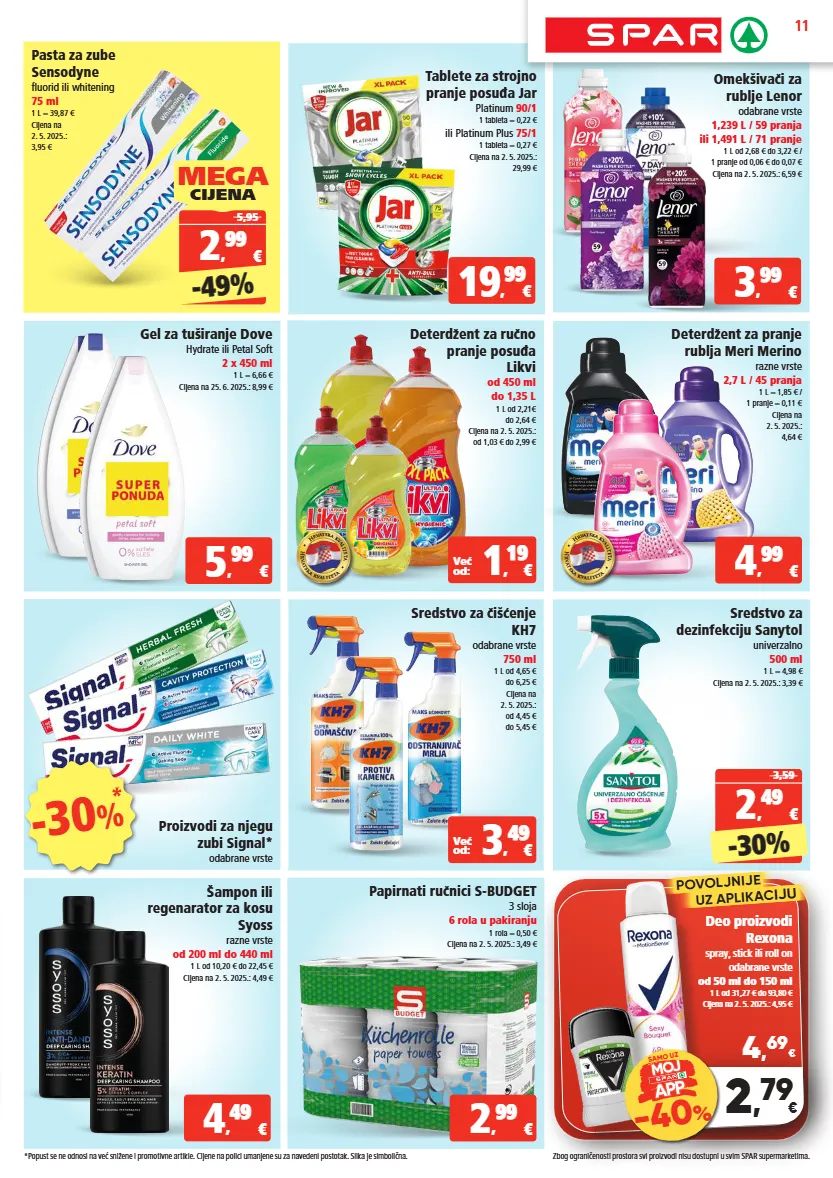 šampon ili regenarator za kosu syoss razne vrste od 200 ml do 440 ml 1 l od 10,20 € do 22,45 € cijena na 2. 5. 2025.: 4,49 € pasta za zube sensodyne fluorid ili whitening 75 ml 1 l = 39,87 € cijena na 2. 5. 2025.: 3,95 € proizvodi za njegu zubi signal* odabrane vrste tablete za strojno pranje posuđa jar platinum 90/1 1 tableta = 0,22 € ili platinum plus 75/1 1 tableta = 0,27 € cijena na 2. 5. 2025.: 29,99 € deterdžent za pranje rublja meri merino razne vrste 2,7 l / 45 pranja 1 l = 1,85 € / 1 pranje = 0,11 € cijena na 2. 5. 2025.: 4,64 € gel za tuširanje dove hydrate ili petal soft 2 x 450 ml 1 l = 6,66 € cijena na 25. 6. 2025.: 8,99 € deterdžent za ručno pranje posuđa likvi od 450 ml do 1,35 l 1 l od 2,21€ do 2,64 € cijena na 2. 5. 2025.: od 1,03 € do 2,99 € sredstvo za dezinfekciju sanytol univerzalno 500 ml 1 l = 4,98 € cijena na 2. 5. 2025.: 3,39 € papirnati ručnici s-budget 3 sloja 6 rola u pakiranju 1 rola = 0,50 € cijena na 2. 5. 2025.: 3,49 € sredstvo za čišćenje kh7 odabrane vrste 750 ml 1 l od 4,65 € do 6,25 € cijena na 2. 5. 2025.: od 4,45 € do 5,45 € omekšivači za rublje lenor odabrane vrste 1,239 l / 59 pranja ili 1,491 l / 71 pranje 1 l od 2,68 € do 3,22 € / 1 pranje od 0,06 € do 0,07 € cijena na 2. 5. 2025.: 6,59 € € 4, 9 99 9 € 2 , 99 99 € 5, 99 99 € 4 , 49 49 € 19 , 9 99 9 € 3 , 9 99 9 h r v a t s k a k v a l i t e t a h r v a t s k a k v a l i t e t a h r v a t s k a k v a l i t e t a h r v a t s k a k v a l i t e t a -30% -30% 3,59 € 2 , 49 49 -49% -49% 5,95 € 2 , 99 99 mega cijena povoljnije uz aplikac iju 4 , 69 € 2 , 79 € deo proizvodi rexona spray, stick ili roll on odabrane vrste od 50 ml do 150 ml 1 l od 31,27 € do 93,80 € cijena na 2. 5. 2025.: 4,95 € -40 % samo uz -30 % već od: € 1 , 19 19 već od: € 3 , 49 49 11 *popust se ne odnosi na već snižene i promotivne artikle. cijene na polici umanjene su za navedeni postotak. slika je simbolična. zbog ograničenosti prostora svi proizvodi nisu dostupni u svim spar supermarketima. 11