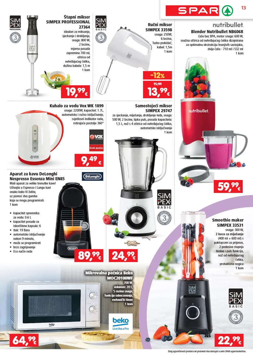 samostojeći mikser simpex 29747 za sjeckanje, miješanje, drobljenje leda, snaga: 500 w, 2 brzine, tipka puls, posuda kapaciteta: 1,5 l, nož s 4 oštrice od nehrđajućeg čelika, automatsko isključivanje 1 kom smoothie maker simpex 33531 snaga: 300 w, 2 boce za miješanje (400 ml + 600 ml) s poklopcem za prijenos, 2 podesiva stupnja brzine i puls funkcija, nož od nehrđajućeg čelika, protuklizne nogice 1 kom mikrovalna pećnica beko moc20100wf 700 w, volumen: 20 l, 5 razina snage, funkcija odmrzavanja, mehanički timer 1 kom 15,99 13, 99 € -12 % 64, 99 € 89, 99 € 59, 99 € 22, 99 € 24, 99 € kuhalo za vodu vox wk 1899 snaga: 2200w, kapacitet: 1.7l, automatsko i ručno isključivanje, svjetlosni indikator rada, rotirajuće postolje 360° štapni mikser simpex professional 27364 idealan za miksanje, sjeckanje i drobljenje, snaga: 800 w, 2 brzine, mjerna posuda zapremine 700 ml, oštrice od nehrđajućeg čelika, dužina kabela: 1,5 m 1 kom ručni mikser simpex 33598 snaga: 250w, 6 brzina, turbo prekidač, kabel: 1,5m 1 kom blender nutribullet nb606r čaše bez bpa, motor snage: 600 w, snažna oštrica od nehrđajućeg čelika dizajnirana za optimalnu ekstrakciju hranjivih sastojaka, dvije čaše - 710 ml i 532 ml 1 kom aparat za kavu delonghi nespresso essenza mini en85 mali aparat za velike trenutke kave! uživajte u espresso i lungo kavi onako kako vi želite, uz pomoć dva gumba koja se mogu programirati. 1 kom • kapacitet spremnika za vodu: 0.6 l • kapacitet posude za iskorištene kapsule: 6 • tlak: 19 bara • automatsko isključivanje nakon 9 minuta, • može se programirati • brzo zagrijavanje • eco način rada 19, 99 € 9, 49 € 13 zbog ograničenosti prostora svi proizvodi nisu dostupni u svim spar supermarketima. 13