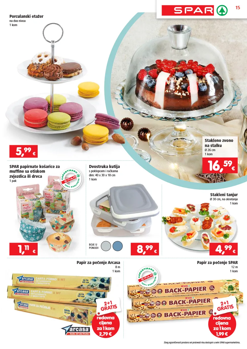 Papir za pečenje SPAR 12 m 1 kom Stakleni tanjur Ø 30 cm, na okretanje 1 kom Papir za pečenje Arcasa 8 m 1 kom Porculanski etažer na dva nivoa 1 kom Dvostruka kutija s poklopcem i ručkama dim: 40 x 30 x 18 cm 1 kom SPAR papirnate košarice za muffine sa otiskom zvjezdica ili drvca 1 pak 8, 99 € 1, 11 € 5, 99 € 4, 99 € 16, 59 € Stakleno zvono na stalku Ø 26 cm 1 kom redovna cijena za 1 kom 2,79 € 2+1 GRATIS redovna cijena za 1 kom 1,99 € 2+1 GRATIS BOJE U PONUDI 15 Zbog ograničenosti prostora svi proizvodi nisu dostupni u svim SPAR supermarketima. 15