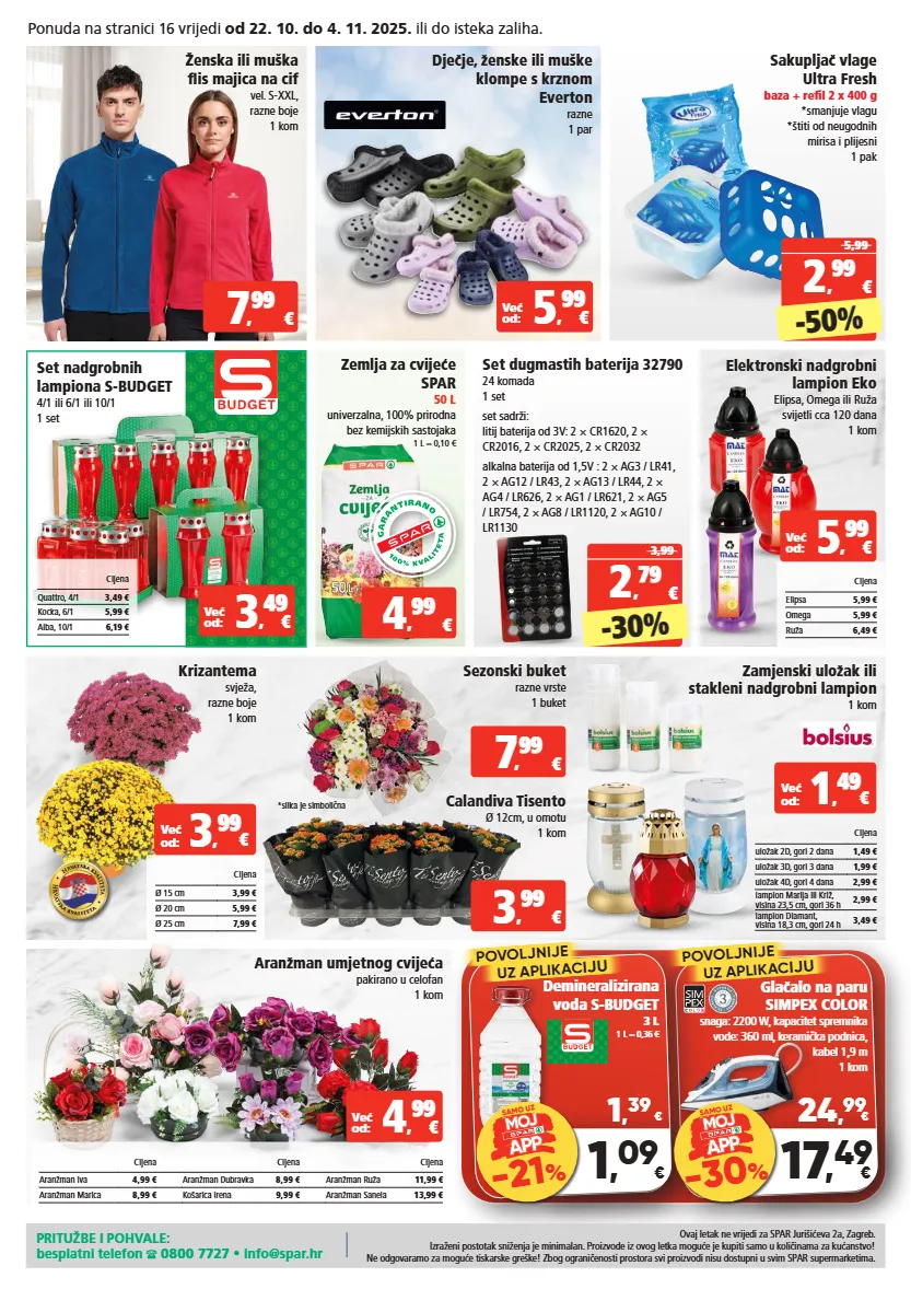 -30% -30% 3,99 € 2 , 7 79 9 -50% -50% 5,99 € 2 , 9 99 9 € 7 , 99 99 € 3 , 99 99 € 4 , 99 99 € 7 , 99 99 sakupljač vlage ultra fresh baza + refil 2 x 400 g *smanjuje vlagu *štiti od neugodnih mirisa i plijesni 1 pak set dugmastih baterija 32790 24 komada 1 set set sadrži: litij baterija od 3v: 2 × cr1620, 2 × cr2016, 2 × cr2025, 2 × cr2032 alkalna baterija od 1,5v : 2 × ag3 / lr41, 2 × ag12 / lr43, 2 × ag13 / lr44, 2 × ag4 / lr626, 2 × ag1 / lr621, 2 × ag5 / lr754, 2 × ag8 / lr1120, 2 × ag10 / lr1130 dječje, ženske ili muške klompe s krznom everton razne 1 par set nadgrobnih lampiona s-budget 4/1 ili 6/1 ili 10/1 1 set zemlja za cvijeće spar 50 l univerzalna, 100% prirodna bez kemijskih sastojaka 1 l = 0,10 € krizantema svježa, razne boje 1 kom sezonski buket razne vrste 1 buket *slika je simbolična aranžman umjetnog cvijeća pakirano u celofan 1 kom calandiva tisento ø 12cm, u omotu 1 kom elektronski nadgrobni lampion eko elipsa, omega ili ruža svijetli cca 120 dana 1 kom zamjenski uložak ili stakleni nadgrobni lampion 1 kom ženska ili muška flis majica na cif vel. s-xxl, razne boje 1 kom već od: € 5 , 99 99 već od: € 3 , 49 49 cijena ø 15 cm 3,99 € ø 20 cm 5,99 € ø 25 cm 7,99 € cijena quattro, 4/1 3,49 € kocka, 6/1 5,99 € alba, 10/1 6,19 € cijena elipsa 5,99 € omega 5,99 € ruža 6,49 € h r v a t s k a k v a l i t e t a h r v a t s k a k v a l i t e t a € već od: 3 , 99 99 povoljnije uz aplikac iju povoljnije uz aplikac iju 24 , 99 € 1 , 39 € 17 , 49 € 1 , 09 € glačalo na paru simpex color snaga: 2200 w, kapacitet spremnika vode: 360 ml, keramička podnica, kabel 1,9 m 1 kom demineralizirana voda s-budget 3 l 1 l = 0,36 € -30 % samo uz -21 % samo uz cijena cijena cijena aranžman iva 4,99 € aranžman dubravka 8,99 € aranžman ruža 11,99 € aranžman marica 8,99 € košarica irena 9,99 € aranžman sanela 13,99 € već od: € 4 , 99 99 već od: € 5 , 99 99 cijena uložak 2d, gori 2 dana 1,49 € uložak 3d, gori 3 dana 1,99 € uložak 4d, gori 4 dana 2,99 € lampion marija ili križ, visina 23,5 cm, gori 36 h 2,99 € lampion diamant, visina 18,3 cm, gori 24 h 3,49 € € već od: 1 , 49 49 prituæbe i pohvale: besplatni telefon 0800 7727 • info@spar.hr ovaj letak ne vrijedi za spar jurišićeva 2a, zagreb. izraženi postotak sniženja je minimalan. proizvode iz ovog letka moguće je kupiti samo u količinama za kućanstvo! ne odgovaramo za moguće tiskarske greške! zbog ograničenosti prostora svi proizvodi nisu dostupni u svim spar supermarketima. ponuda na stranici 16 vrijedi od 22. 10. do 4. 11. 2025. ili do isteka zaliha.