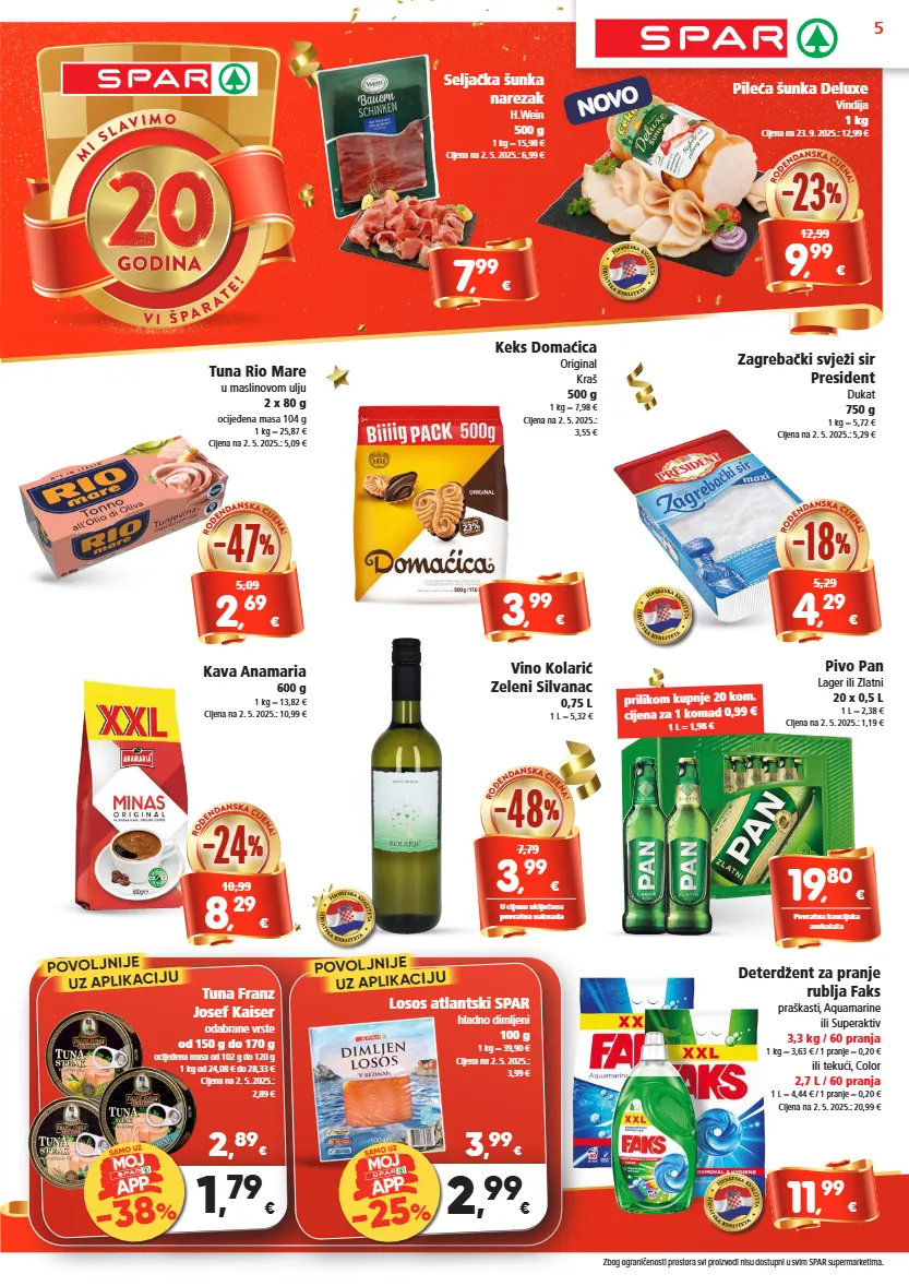 m i s l a v i m o v i š p a r a t e ! povoljnije uz aplikac iju 3 , 99 € 2 , 99 € losos atlantski spar hladno dimljeni 100 g 1 kg = 39,90 € cijena na 2. 5. 2025.: 3,99 € -25 % samo uz prilikom kupnje 20 kom. cijena za 1 komad 0,99 € 1 l = 1,98 € h r v a t s k a k v a l i t e t a h r v a t s k a k v a l i t e t a h r v a t s k a k v a l i t e t a h r v a t s k a k v a l i t e t a r o đ e n d a n s k a c i j e n a ! -47 % 2 , 69 € 5,09 r o đ e n d a n s k a c i j e n a ! -23 % 9 , 99 € 12,99 r o đ e n d a n s k a c i j e n a ! -24 % 8 , 29 € 10,99 r o đ e n d a n s k a c i j e n a ! -18 % 4 , 29 € 5,29 r o đ e n d a n s k a c i j e n a ! -48 % 3 , 99 € 7,79 u cijenu uključena povratna naknada 19 , 80 € povratna kaucijska ambalaža pileća šunka deluxe vindija 1 kg cijena na 23. 9. 2025.: 12,99 € seljačka šunka narezak h.wein 500 g 1 kg = 15,98 € cijena na 2. 5. 2025.: 6,99 € zagrebački svježi sir president dukat 750 g 1 kg = 5,72 € cijena na 2. 5. 2025.: 5,29 € keks domaćica original kraš 500 g 1 kg = 7,98 € cijena na 2. 5. 2025.: 3,55 € kava anamaria 600 g 1 kg = 13,82 € cijena na 2. 5. 2025.: 10,99 € pivo pan lager ili zlatni 20 x 0,5 l 1 l = 2,38 € cijena na 2. 5. 2025.: 1,19 € tuna rio mare u maslinovom ulju 2 x 80 g ocijeđena masa 104 g 1 kg = 25,87 € cijena na 2. 5. 2025.: 5,09 € deterdžent za pranje rublja faks praškasti, aquamarine ili superaktiv 3,3 kg / 60 pranja 1 kg = 3,63 € / 1 pranje = 0,20 € ili tekući, color 2,7 l / 60 pranja 1 l = 4,44 € / 1 pranje = 0,20 € cijena na 2. 5. 2025.: 20,99 € vino kolarić zeleni silvanac 0,75 l 1 l = 5,32 € tuna franz josef kaiser odabrane vrste od 150 g do 170 g ocijeđena masa od 102 g do 120 g 1 kg od 24,08 € do 28,33 € cijena na 2. 5. 2025.: 2,89 € povoljnije uz aplikac iju 2 , 89 € 1 , 79 € -38 % samo uz 7 , 99 € 3 , 99 € 11 , 99 € h r v a t s k a k v a l i t e t a h r v a t s k a k v a l i t e t a h r v a t s k a k v a l i t e t a h r v a t s k a k v a l i t e t a novo 5 zbog ograničenosti prostora svi proizvodi nisu dostupni u svim spar supermarketima. 5