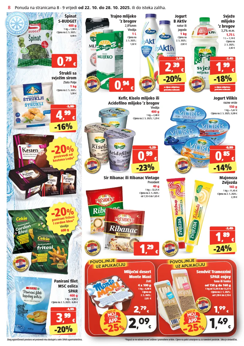 špinat s-budget 400 g 1 kg = 1,98 € cijena na 2. 5. 2025.: 0,99 € štrukli sa svježim sirom zlato polje 1 kg cijena na 2. 5. 2025.: 5,99 € -16% -16% 5,99 € 4 , 9 99 9 -20% -20% 4,99 € 3 , 9 99 9 € 0 , 79 79 € 0 , 94 94 povoljnije uz aplikac iju 2 , 79 € 2 , 09 € mliječni desert monte maxi zott 4 x 100 g 1 kg = 6,98 € cijena na 2. 5. 2025.: 2,65 € -25 % samo uz povoljnije uz aplikac iju 1 , 99 € 1 , 49 € sendvič tramezzini spar enjoy tuna ili šunka od 150 g do 160 g 1 kg od 12,44 € do 13,27 € cijena na 2. 5. 2025.: od 1,99 € do 2,19 € -25 % samo uz h r v a t s k a k v a l i t e t a h r v a t s k a k v a l i t e t a trajno mlijeko ‘z bregov 2,8%mm vindija 1 l cijena na 2. 5. 2025.: 1,02 € kefir, kiselo mlijeko ili acidofilno mlijeko ‘z bregov vindija 400 g 1 kg = 2,48 € cijena na 2. 5. 2025.: 1,29 € sir ribanac ili ribanac vintage president 40 g 1 kg = 32,25 € cijena na 2. 5. 2025.: od 1,55 € do 1,65 € jogurt vilikis razne vrste 150 g 1 kg = 5,67 € cijena na 2. 5. 2025.: 0,99 € majoneza zvijezda 165 g 1 kg = 11,45 € cijena na 2. 5. 2025.: 2,39 € jogurt b aktiv natur ili jagoda 1 kg cijena na 2. 5. 2025.: 2,82 € svježe mlijeko ‘z bregov 3,2% m.m. 1,75 l 1 l = 1,14 € cijena na 2. 5. 2025.: 2,42 € u cijenu uključena povratna naknada u cijenu uključena povratna naknada -20% -20% 2,99 € 2 , 39 39 -23% -23% 1,29 € 0 , 99 99 -14% -14% 0,99 € 0 , 85 85 -24% -24% 2,49 € 1 , 89 89 u cijenu uključena povratna naknada -18% -18% 2,45 € 1 , 99 99 h r v a t s k a k v a l i t e t a h r v a t s k a k v a l i t e t a h r v a t s k a k v a l i t e t a h r v a t s k a k v a l i t e t a h r v a t s k a k v a l i t e t a h r v a t s k a k v a l i t e t a h r v a t s k a k v a l i t e t a h r v a t s k a k v a l i t e t a h r v a t s k a k v a l i t e t a h r v a t s k a k v a l i t e t a h r v a t s k a k v a l i t e t a h r v a t s k a k v a l i t e t a h r v a t s k a k v a l i t e t a h r v a t s k a k v a l i t e t a h r v a t s k a k v a l i t e t a h r v a t s k a k v a l i t e t a € 1 , 29 29 - 20 % proizvodi od kestena ledo* - 20 % panirani fritesi i cordon bleu* vindija 600 g panirani filet msc oslića spar 400 g 1 kg = 9,98 € cijena na 2. 5. 2025.: 4,49 € 8 *popust se ne odnosi na već snižene i promotivne artikle. cijene na polici umanjene su za navedeni postotak. slika je simbolična. zbog ograničenosti prostora svi proizvodi nisu dostupni u svim spar supermarketima. ponuda na stranicama 8 - 9 vrijedi od 22. 10. do 28. 10. 2025. ili do isteka zaliha.