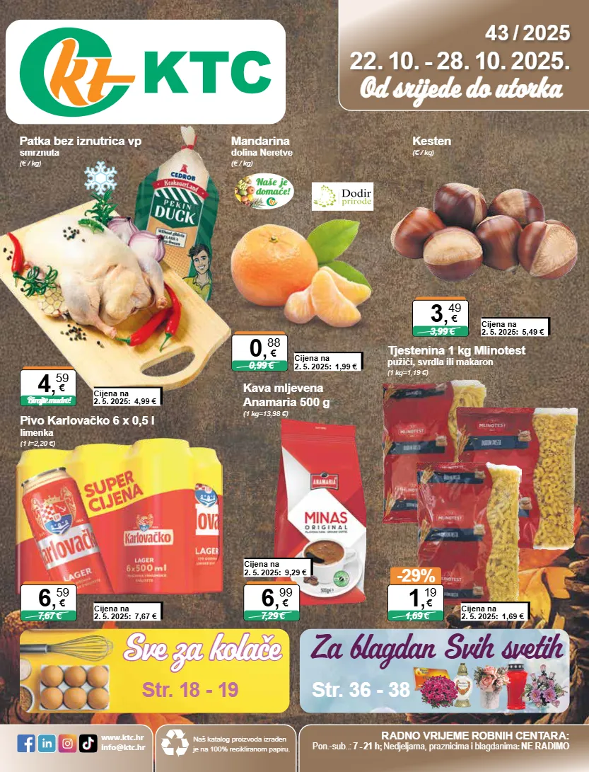 naš katalog proizvoda izrađen je na 100% recikliranom papiru. radno vrijeme robnih centara: pon.-sub..: 7 - 21 h ; nedjeljama, praznicima i blagdanima : ne radimo www.ktc.hr info@ktc.hr 43 / 2025 22. 10. - 28. 10. 2025. od srijede do utorka cijena na 2. 5. 2025: 4,99 € cijena na 2. 5. 2025: 1,69 € cijena na 2. 5. 2025: 7,67 € cijena na 2. 5. 2025: 9,29 € cijena na 2. 5. 2025: 1,99 € cijena na 2. 5. 2025: 5,49 € naše je domaće! patka bez iznutrica vp smrznuta (€ / kg) birajte mudro! 4 , 59 € tjestenina 1 kg mlinotest pužići, svrdla ili makaron (1 kg=1,19 €) -29% 1,69 € 1 , 19 € pivo karlovačko 6 x 0,5 l limenka (1 l=2,20 €) 7,67 € 6 , 59 € kava mljevena anamaria 500 g (1 kg=13,98 €) 7,29 € 6 , 99 € mandarina dolina neretve (€ / kg) 0,99 € 0 , 88 € kesten (€ / kg) 3,99 € 3 , 49 € sve za kolače sve za kolače str. 18 - 19 str. 36 - 38 za blagdan svih svetih