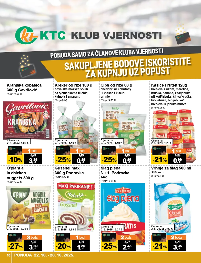ponuda samo za članove kluba vjernosti sakupljene bodove iskoristite za kupnju uz popust klub vjernosti 10 ponuda 17.9. - 23.9.2025. cijena na 2. 5. 2025: 4,09 € cijena na 2. 5. 2025: 1,19 € cijena na 2. 5. 2025: 1,19 € cijena na 2. 5. 2025: 1,99 € cijena na 2. 5. 2025: 3,27 € cijena na 2. 5. 2025: 1,26 € kranjska kobasica 300 g gavrilović (1 kg=11,30 €) kreker od riže 100 g havajska morska sol ili sa sjemenkama ili chia, kvinoja i amarant (1 kg=8,9 €) čips od riže 60 g cheddar sir i chutney ili vlasac i kiselo vrhnje (1 kg=14,83 €) o'plant a la chicken nuggets 300 g (1 kg=12,97 €) vrhnje za šlag 500 ml 36% m.m. (1 kg=6,7 €) gussnel maxi 300 g podravka (1 kg=5,30 €) šlag pjena 3 + 1 podravka 144g (1 kg=16,87 €) kašice frutek 120g breskva s rižom, marelica, kruška, banana, žita/jabuka, piškoti/jabuka, šljiva/kruška, bio jabuka, bio jabuka/ breskva ili jabuka/mrkva (1 kg=8,25 €) 1,99 1 , 59 - 20 % 1 bod € 1,19 0 , 89 - 25 % 1 bod € 3,27 2 , 43 - 25 % 2 boda € 1,26 0 , 99 - 21 % 1 bod € cijena na 2. 5. 2025: 5,39 € 5,39 3 , 89 - 27 % 3 boda € cijena na 2. 5. 2025: 3,99 € 4,29 3 , 35 - 21 % 2 boda € 3,79 3 , 39 - 10 % 1 bod € 1,19 0 , 89 - 25 % 1 bod € 10 ponuda 22. 10. - 28. 10. 2025.