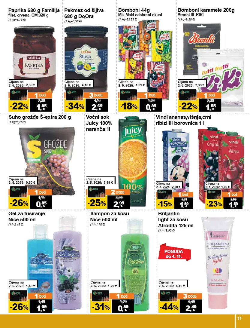 cijena na 2. 5. 2025: 0,80 € cijena na 2. 5. 2025: 4,10 € cijena na 2. 5. 2025: 2,39 € cijena na 2. 5. 2025: 2,39 € cijena na 2. 5. 2025: 1,09 € cijena na 2. 5. 2025: 2,19 € cijena na 2. 5. 2025: 2,09 € cijena na 2. 5. 2025: 1,89 € cijena na 2. 5. 2025: 1,49 € cijena na 2. 5. 2025: 1,29 € cijena na 2. 5. 2025: 4,49 € suho grožđe š-extra 200 g (1 kg=4,25 €) pekmez od šljiva 680 g doora (1 kg=3,96 €) 1,15 0 , 85 - 26 % 1 bod € 4,10 2 , 69 - 34 % 3 boda € paprika 680 g familija filet, crvena, om:320 g (1 kg=5,78 €) bomboni karamele 200g bronhi ili kiki (1 kg=9,25 €) bomboni 44g mik maki odabrani okusi (1 kg=22,23 €) 1,09 0 , 89 - 18 % 1 bod € 2,39 1 , 85 - 22 % 1 bod € 2,39 1 , 85 - 22 % 1 bod € ponuda do 4. 11. 1,49 1 , 09 - 26 % 1 bod € 1,29 0 , 89 - 31 % 1 bod € 1,89 1 , 59 - 15 % 1 bod € 2,09 1 , 59 - 23 % 1 bod € 3,99 2 , 99 - 25 % 2 boda € 4,49 2 , 49 - 44 % 3 boda € voćni sok juicy 100% naranča 1l vindi ananas,višnja,crni ribizl ili borovnica 1 l gel za tuširanje nice 500 ml (1 l=2,18 €) šampon za kosu nice 500 ml (1 l=1,78 €) briljantin light za kosu afrodita 125 ml (1 l=19,92 €) 11