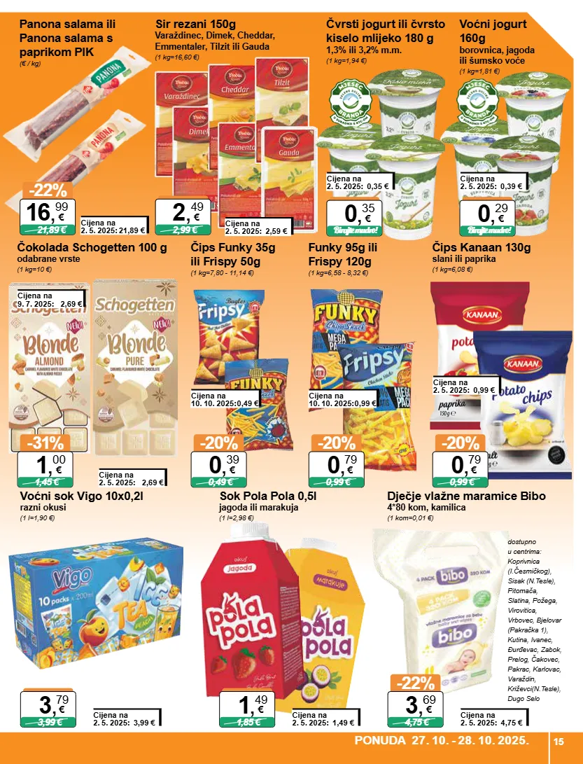 dostupno u centrima: koprivnica (i.česmičkog), sisak (n.tesle), pitomača, slatina, požega, virovitica, vrbovec, bjelovar (pakračka 1), kutina, ivanec, đurđevac, zabok, prelog, čakovec, pakrac, karlovac, varaždin, križevci(n.tesle), dugo selo cijena na 2. 5. 2025: 21,89 € cijena na 2. 5. 2025: 2,59 € cijena na 2. 5. 2025: 0,35 € cijena na 2. 5. 2025: 0,39 € cijena na 9. 7. 2025: 2,69 € cijena na 2. 5. 2025: 2,69 € cijena na 10. 10. 2025:0,49 € cijena na 10. 10. 2025:0,99 € cijena na 2. 5. 2025: 0,99 € cijena na 2. 5. 2025: 3,99 € cijena na 2. 5. 2025: 1,49 € cijena na 2. 5. 2025: 4,75 € panona salama ili panona salama s paprikom pik (€ / kg) -22% 21,89 € 16 , 99 € sir rezani 150g varaždinec, dimek, cheddar, emmentaler, tilzit ili gauda (1 kg=16,60 €) 2,99 € 2 , 49 € čvrsti jogurt ili čvrsto kiselo mlijeko 180 g 1,3% ili 3,2% m.m. (1 kg=1,94 €) birajte mudro! 0 , 35 € voćni jogurt 160g borovnica, jagoda ili šumsko voće (1 kg=1,81 €) birajte mudro! 0 , 29 € čokolada schogetten 100 g odabrane vrste (1 kg=10 €) -31% 1,45 € 1 , 00 € čips funky 35g ili frispy 50g (1 kg=7,80 - 11,14 €) -20% 0,49 € 0 , 39 € funky 95g ili frispy 120g (1 kg=6,58 - 8,32 €) -20% 0,99 € 0 , 79 € čips kanaan 130g slani ili paprika (1 kg=6,08 €) -20% 0,99 € 0 , 79 € voćni sok vigo 10x0,2l razni okusi (1 l=1,90 €) 3,99 € 3 , 79 € sok pola pola 0,5l jagoda ili marakuja (1 l=2,98 €) 1 , 49 € dječje vlažne maramice bibo 4*80 kom, kamilica (1 kom=0,01 €) -22% 4,75 € 3 , 69 € 1,85 € 15 ponuda 27. 10. - 28. 10. 2025.