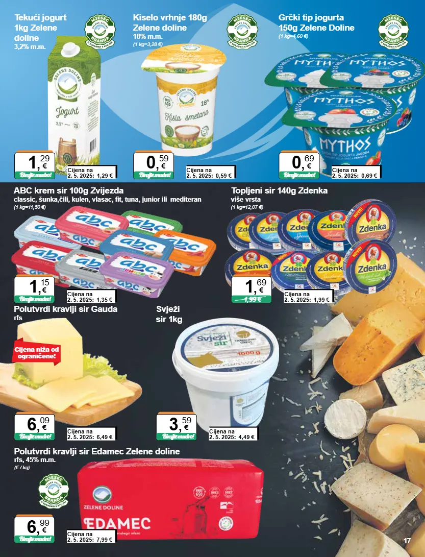 cijena na 2. 5. 2025: 6,49 € cijena na 2. 5. 2025: 1,29 € cijena na 2. 5. 2025: 0,59 € cijena na 2. 5. 2025: 0,69 € cijena na 2. 5. 2025: 1,35 € cijena na 2. 5. 2025: 4,49 € cijena na 2. 5. 2025: 1,99 € cijena niža od ograničene! polutvrdi kravlji sir gauda rfs birajte mudro! 6 , 09 € polutvrdi kravlji sir edamec zelene doline rfs, 45% m.m. (€ / kg) cijena na 2. 5. 2025: 7,99 € birajte mudro! 6 , 99 € tekući jogurt 1kg zelene doline 3,2% m.m. birajte mudro! 1 , 29 € kiselo vrhnje 180g zelene doline 18% m.m. (1 kg=3,28 €) birajte mudro! 0 , 59 € grčki tip jogurta 150g zelene doline (1 kg=4,60 €) birajte mudro! 0 , 69 € abc krem sir 100g zvijezda classic, šunka,čili, kulen, vlasac, fit, tuna, junior ili mediteran (1 kg=11,50 €) birajte mudro! 1 , 15 € svježi sir 1kg birajte mudro! 3 , 59 € topljeni sir 140g zdenka više vrsta (1 kg=12,07 €) 1,99 € 1 , 69 € 17
