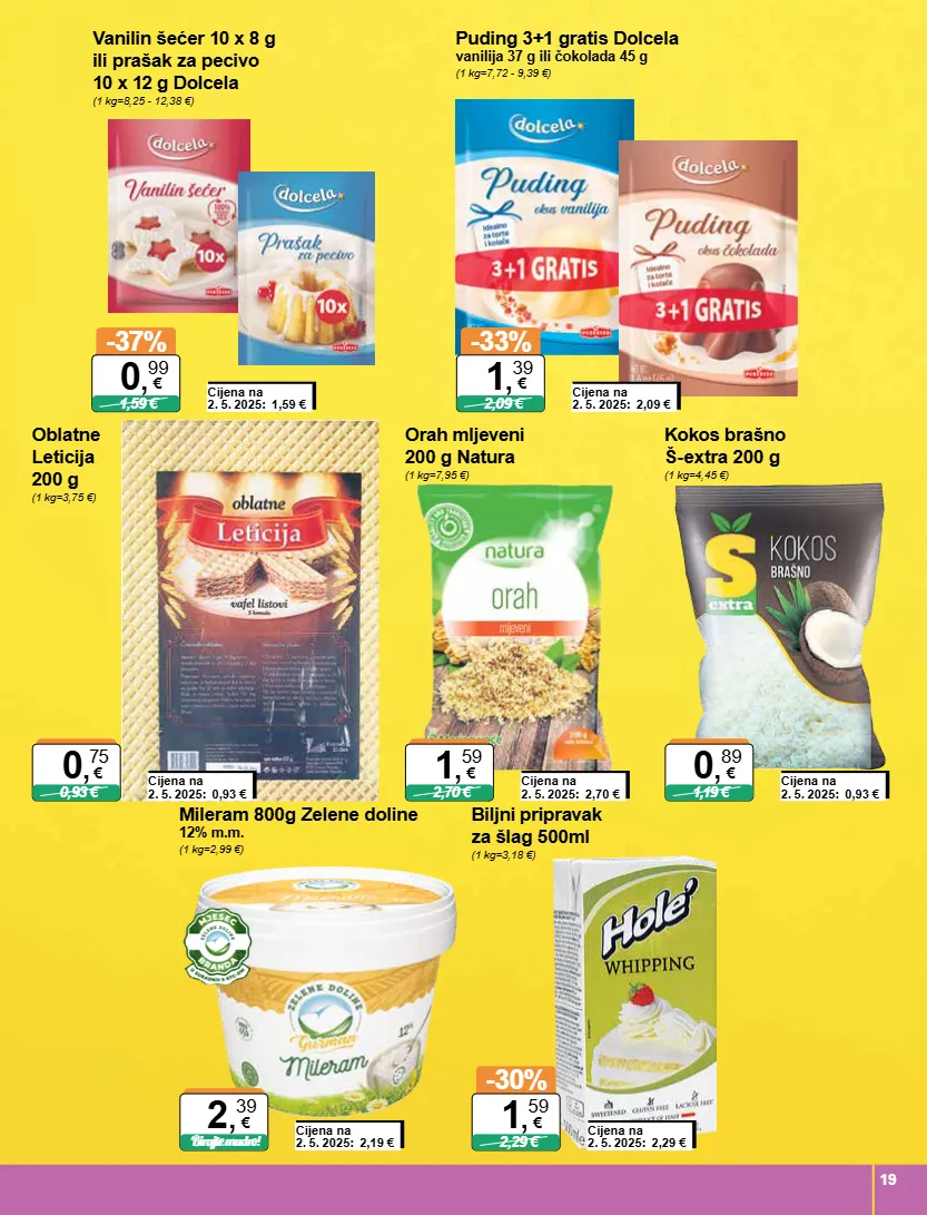 cijena na 2. 5. 2025: 2,19 € cijena na 2. 5. 2025: 2,29 € cijena na 2. 5. 2025: 0,93 € cijena na 2. 5. 2025: 2,70 € cijena na 2. 5. 2025: 0,93 € cijena na 2. 5. 2025: 1,59 € cijena na 2. 5. 2025: 2,09 € mileram 800g zelene doline 12% m.m. (1 kg=2,99 €) birajte mudro! 2 , 39 € biljni pripravak za šlag 500ml (1 kg=3,18 €) -30% 2,29 € 1 , 59 € oblatne leticija 200 g (1 kg=3,75 €) 0,93 € 0 , 75 € orah mljeveni 200 g natura (1 kg=7,95 €) 2,70 € 1 , 59 € kokos brašno š-extra 200 g (1 kg=4,45 €) 1,19 € 0 , 89 € vanilin šećer 10 x 8 g ili prašak za pecivo 10 x 12 g dolcela (1 kg=8,25 - 12,38 €) -37% 1,59 € 0 , 99 € puding 3+1 gratis dolcela vanilija 37 g ili čokolada 45 g (1 kg=7,72 - 9,39 €) -33% 2,09 € 1 , 39 € 19