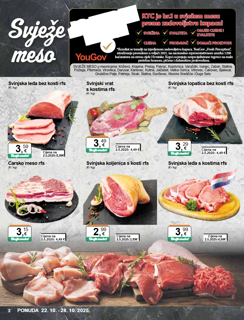 svježe meso u mesnicama: križevci, krapina, prelog, pakrac, koprivnica, varaždin, ivanec, zabok, slatina, požega, pitomača, virovitica, daruvar, karlovac, kutina, jalžabet, velika gorica, vrbovec, čakovec, bjelovar, grubišno polje, petrinja, sisak, slatina, đurđevac, mursko središće i dugo selo ktc je br.1 u svježem mesu ktc je br.1 u svježem mesu prema zadovoljstvu kupaca! prema zadovoljstvu kupaca! *rezultat se temelji na izjavljenom zadovoljstvu kupaca. yougov „fresh perception”, istraživanje provedeno u veljači 2025. na nacionalno reprezentativnom uzorku 1200 kućanstava na nivou cijele hrvatske. kupci ocjenjuju nespecijalizirane trgovce na malo pretežno hranom, pićima i duhanskim proizvodima. domaći proizvodi domaći proizvodi omjer cijene i omjer cijene i kvalitete kvalitete prodavač prodavač kvaliteta kvaliteta svježina svježina cijena cijena potvrdili kupci cijena na 2.5.2025: 3,59€ cijena na 2.5.2025: 5,99€ cijena na 2.5.2025: 4,99€ cijena na 2.5.2025: 4,49 € cijena na 2.5.2025: 4,49 € cijena na 2.5.2025: 4,49 € svinjska lopatica bez kosti rfs (€ / kg) carsko meso rfs (€ / kg) svinjski vrat s kostima rfs (€ / kg) svinjska koljenica s kosti rfs (€ / kg) svinjska leđa bez kosti rfs (€ / kg) svinjska leđa s kostima rfs (€ / kg) birajte mudro! 3 , 29 € birajte mudro! 3 , 49 € birajte mudro! 3 , 15 € birajte mudro! 2 , 99 € birajte mudro! 3 , 59 € birajte mudro! 3 , 99 € ponuda 22. 10. - 28. 10. 2025. 2 svježe meso