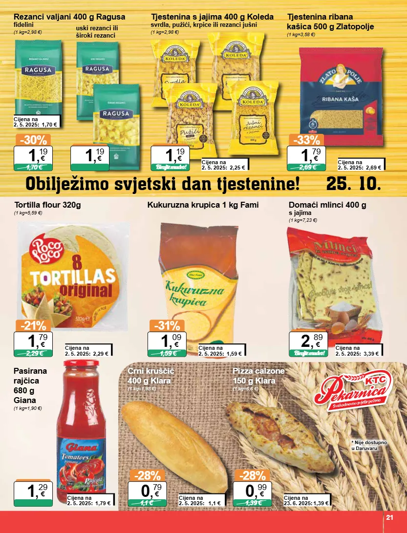 obilježimo svjetski dan tjestenine! 25. 10. cijena na 2. 5. 2025: 2,29 € cijena na 2. 5. 2025: 1,70 € cijena na 2. 5. 2025: 2,25 € cijena na 2. 5. 2025: 2,69 € cijena na 2. 5. 2025: 3,39 € cijena na 2. 5. 2025: 1,59 € cijena na 2. 5. 2025: 1,1 € cijena na 23. 6. 2025: 1,39 € cijena na 2. 5. 2025: 1,79 € p p ekarnica ekarnica kt ktc c p ekarnica ktc * nije dostupno u daruvaru tortilla flour 320g (1 kg=5,59 €) -21% 2,29 € 1 , 79 € rezanci valjani 400 g ragusa fidelini (1 kg=2,98 €) -30% 1,70 € 1 , 19 € uski rezanci ili široki rezanci 1 , 19 € tjestenina s jajima 400 g koleda svrdla, pužići, krpice ili rezanci jušni (1 kg=2,98 €) birajte mudro! 1 , 19 € tjestenina ribana kašica 500 g zlatopolje (1 kg=3,58 €) -33% 2,69 € 1 , 79 € domaći mlinci 400 g s jajima (1 kg=7,23 €) birajte mudro! 2 , 89 € kukuruzna krupica 1 kg fami -31% 1,59 € 1 , 09 € crni kruščić 400 g klara (1 kg=1,98 €) -28% 1,1 € 0 , 79 € pizza calzone 150 g klara (1 kg=6,6 €) -28% 1,39 € 0 , 99 € pasirana rajčica 680 g giana (1 kg=1,90 €) 1 , 29 € 21