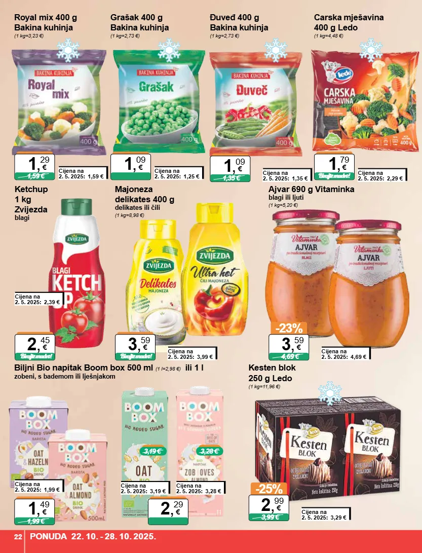 cijena na 2. 5. 2025: 2,29 € cijena na 2. 5. 2025: 3,29 € cijena na 2. 5. 2025: 1,25 € cijena na 2. 5. 2025: 1,59 € cijena na 2. 5. 2025: 1,35 € cijena na 2. 5. 2025: 3,28 € cijena na 2. 5. 2025: 3,19 € cijena na 2. 5. 2025: 1,99 € cijena na 2. 5. 2025: 3,99 € cijena na 2. 5. 2025: 4,69 € cijena na 2. 5. 2025: 2,39 € carska mješavina 400 g ledo (1 kg=4,48 €) birajte mudro! 1 , 79 € kesten blok 250 g ledo (1 kg=11,96 €) -25% 3,99 € 2 , 99 € grašak 400 g bakina kuhinja (1 kg=2,73 €) 1 , 09 € royal mix 400 g bakina kuhinja (1 kg=3,23 €) 1,59 € 1 , 29 € đuveđ 400 g bakina kuhinja (1 kg=2,73 €) 1,35 € 1 , 09 € 3,28 € 3,19 € biljni bio napitak boom box 500 ml (1 l=2,98 €) ili 1 l zobeni, s bademom ili lješnjakom 1,99 € 1 , 49 € 2 , 29 € majoneza delikates 400 g delikates ili čili (1 kg=8,98 €) birajte mudro! 3 , 59 € ajvar 690 g vitaminka blagi ili ljuti (1 kg=5,20 €) -23% 4,69 € 3 , 59 € ketchup 1 kg zvijezda blagi birajte mudro! 2 , 45 € ponuda 22. 10. - 28. 10. 2025. 22