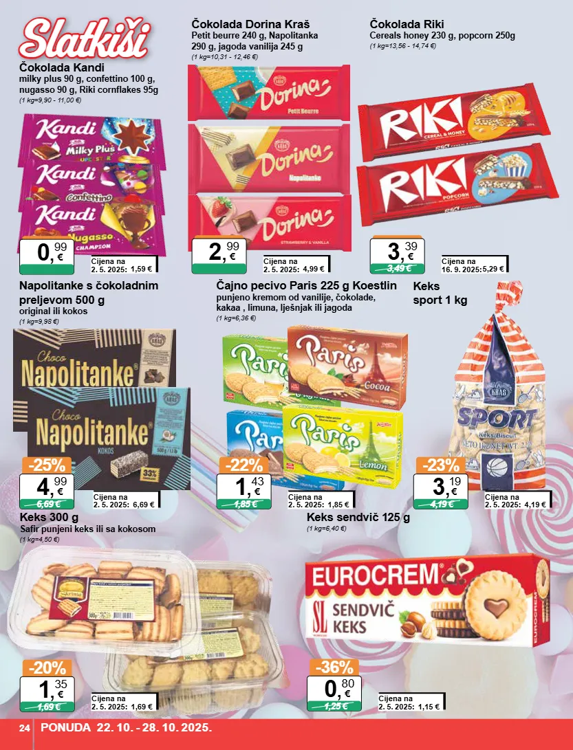 cijena na 2. 5. 2025: 1,59 € cijena na 16. 9. 2025:5,29 € cijena na 2. 5. 2025: 1,85 € cijena na 2. 5. 2025: 4,99 € cijena na 2. 5. 2025: 6,69 € cijena na 2. 5. 2025: 4,19 € cijena na 2. 5. 2025: 1,69 € cijena na 2. 5. 2025: 1,15 € čokolada kandi milky plus 90 g, confettino 100 g, nugasso 90 g, riki cornflakes 95g (1 kg=9,90 - 11,00 €) 0 , 99 € čokolada riki cereals honey 230 g, popcorn 250g (1 kg=13,56 - 14,74 €) 3,49 € 3 , 39 € čajno pecivo paris 225 g koestlin punjeno kremom od vanilije, čokolade, kakaa , limuna, lješnjak ili jagoda (1 kg=6,36 €) -22% 1,85 € 1 , 43 € čokolada dorina kraš petit beurre 240 g, napolitanka 290 g, jagoda vanilija 245 g (1 kg=10,31 - 12,46 €) 2 , 99 € napolitanke s čokoladnim preljevom 500 g original ili kokos (1 kg=9,98 €) -25% 6,69 € 4 , 99 € keks sport 1 kg -23% 4,19 € 3 , 19 € keks 300 g safir punjeni keks ili sa kokosom (1 kg=4,50 €) -20% 1,69 € 1 , 35 € keks sendvič 125 g (1 kg=6,40 €) -36% 1,25 € 0 , 80 € ponuda 22. 10. - 28. 10. 2025. 24 slatkiši slatkiši